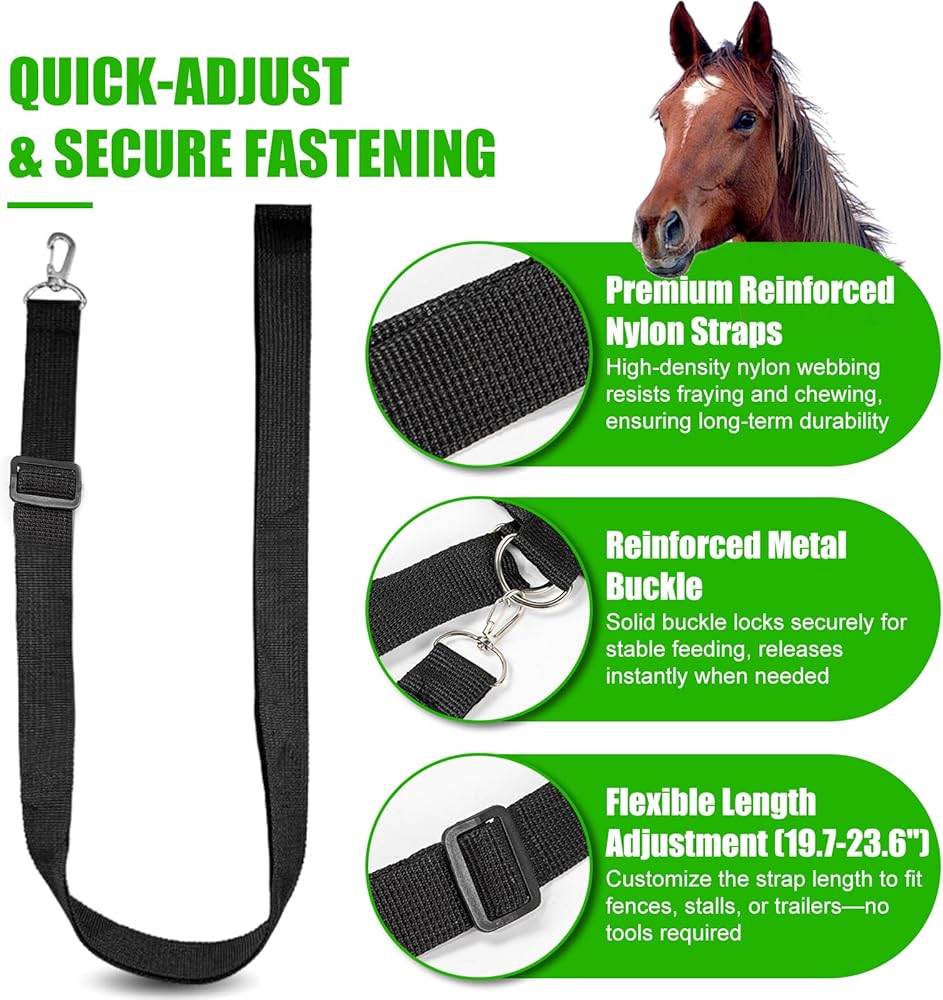 • Easy to Hang & Adjust – Features adjustable nylon straps with sturdy metal ring, allowing instant hanging on fences, stalls, or trailers without tools. Folds compactly for travel and storage, making it convenient for both farm and outdoor use.