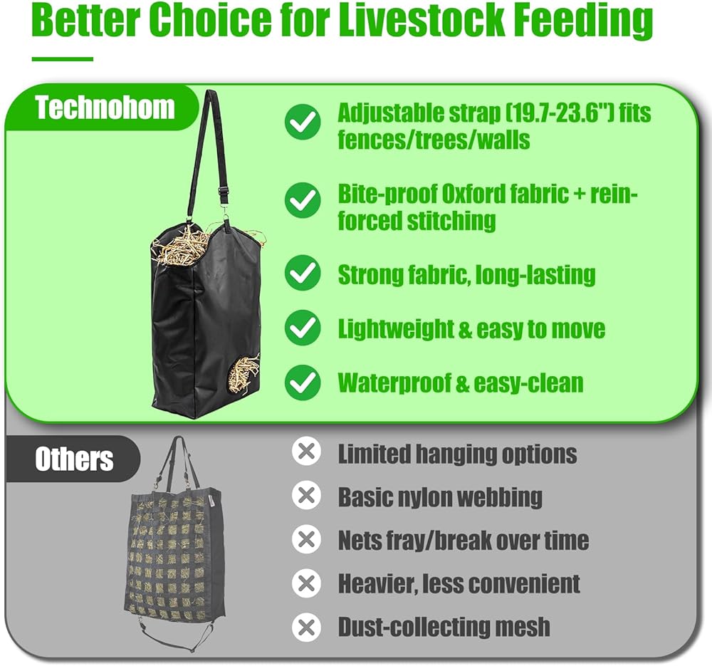 Technohom 4PCS Hay Bags are a durable and practical feeding solution designed for horses, goats, rabbits, guinea pigs, donkeys, cows, and other livestock. Made from premium Oxford cloth with a waterproof coating and reinforced stitching, these hay bags are built to resist tearing, abrasion, and weather damage, ensuring long-lasting use on farms, stables, and outdoor settings. Each bag features a large 20L capacity with feeding holes that allow controlled feeding, helping reduce hay waste and keeping feeding areas clean and organized. The hay bags are easy to install and adjust. Equipped with adjustable nylon straps and a sturdy metal ring, they can be quickly hung on fences, stalls, or trailers without the need for tools. When not in use, the bags fold compactly for convenient storage. The hanging design keeps hay off the ground, maintaining freshness and cleanliness while allowing livestock to feed comfortably at a natural pace. This value 4-pack set is ideal for daily feeding in farms, ranches, and stables. With breathable mesh sides and strong construction, these hay bags provide a reliable and efficient feeding solution for a variety of animals in different feeding areas.