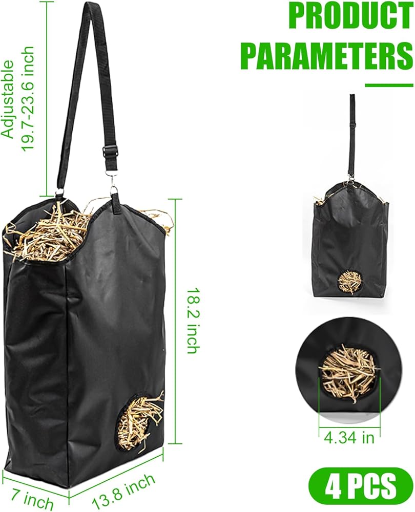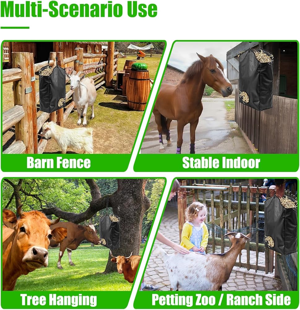 • Convenient 4-Pack Set – Includes four hay bags suitable for horses, goats, rabbits, guinea pigs, donkeys, cows, and more. Breathable mesh sides help maintain hay freshness, making them ideal for daily feeding in farms, stables, ranches, or during short-distance transport between locations.