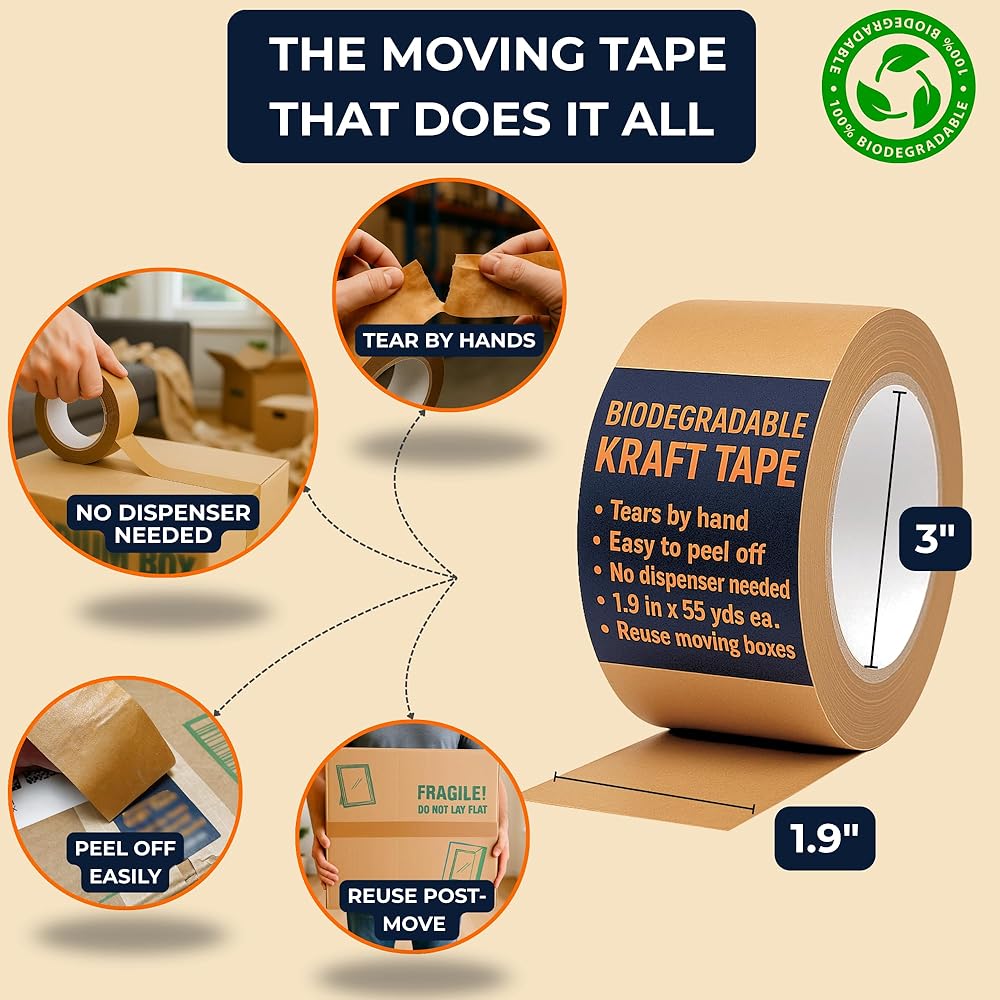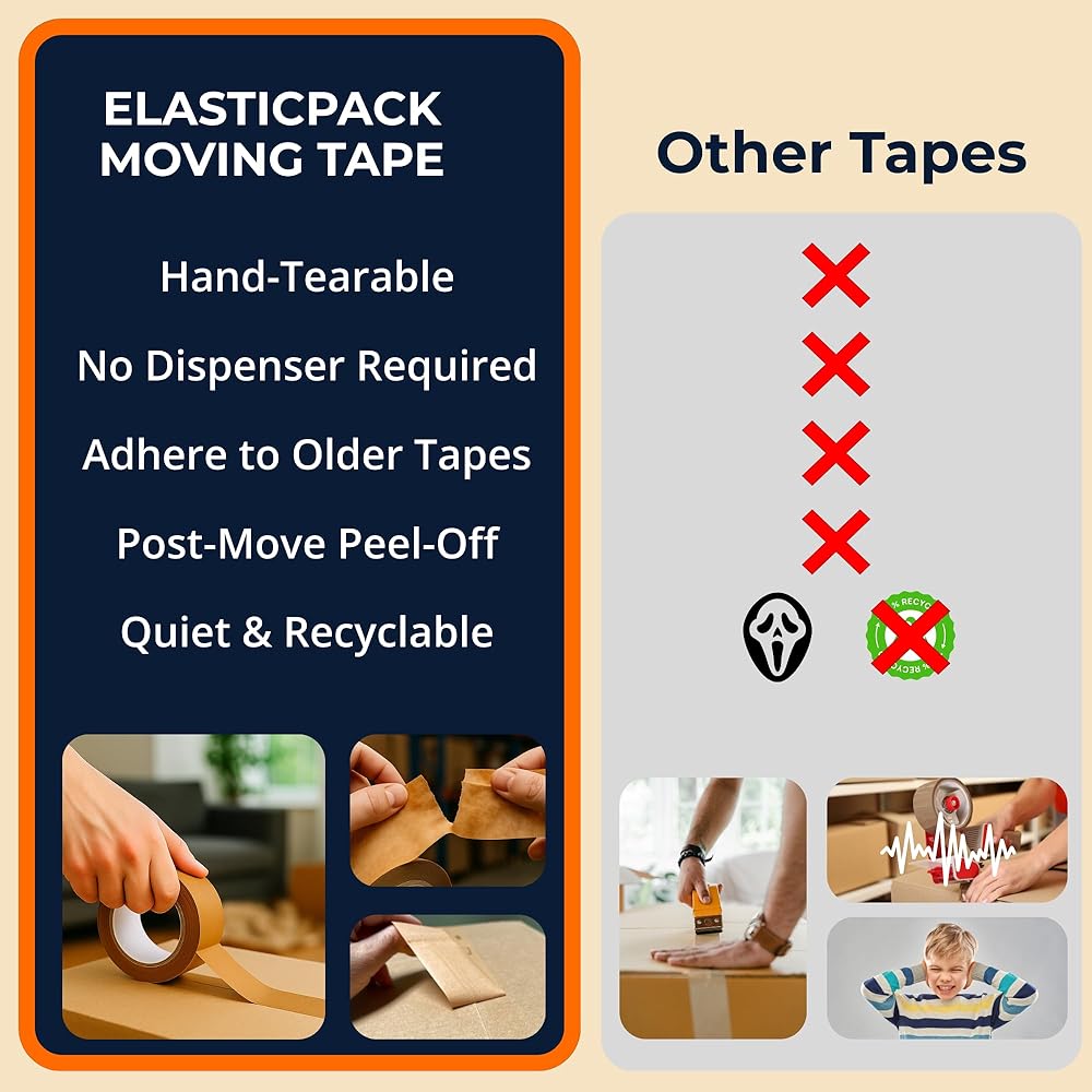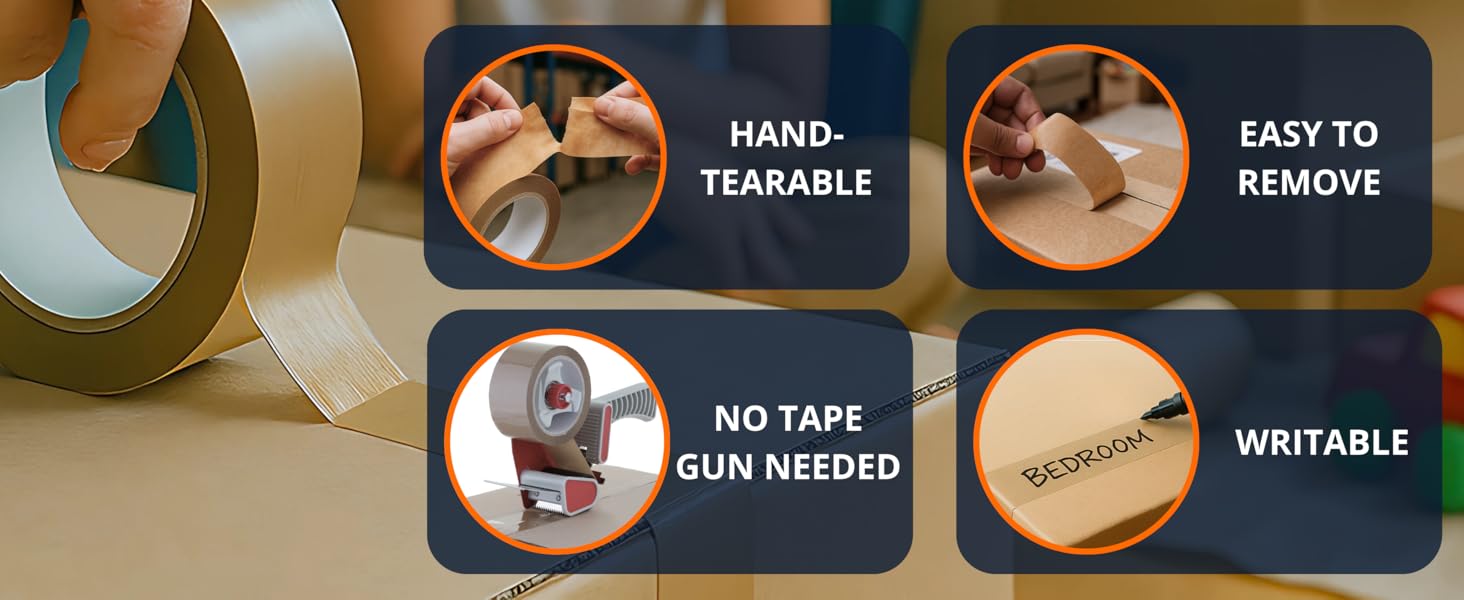قم بإزالة بسهولة وإعادة استخدام الصناديق الخاصة بك - قم بفك الحمل دون تمزيق الصناديق الخاصة بك. تنظيف هذا الشريط ، مما يساعدك على إعادة استخدام الكراتين المتحركة لنخطتك التالية أو إعادة البيع أو التخزين.