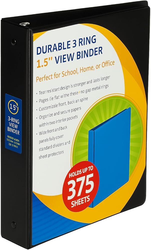 يحمل رابط حلقة 3 حلقة ، و 1.5 بوصة من الحلقات الدائرية ، مثالية للمدرسة والمنزل والمكتب ، ما يصل إلى 375 ورقة من حجم الحروف ، والغطاء الثابت الثقيل ، ومقاومة للماء ، أسود (حزمة واحدة)