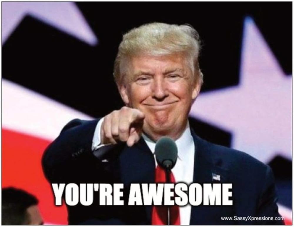 Postcard Size (4.5 inches by 5.25 inches). President Trump Pointing his finger at your recipient saying "You're Awesome". Notecards have a blank backside that can be used to write your own message to your Awesome Recipient.