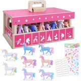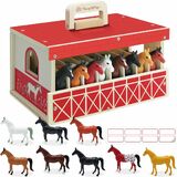 تشمل الخيول ومجموعة اللعب المستقرة - حظيرة لعبة خشبية قوية و 8 شخصيات حصان ملونة في سلالات وأنماط مختلفة. تتم طباعة دليل سلالة مع حقائق أساسية حول الخيول المميزة على صندوق ألوان المنتج لمساعدة الأطفال على التمييز بين أنواع الخيول.