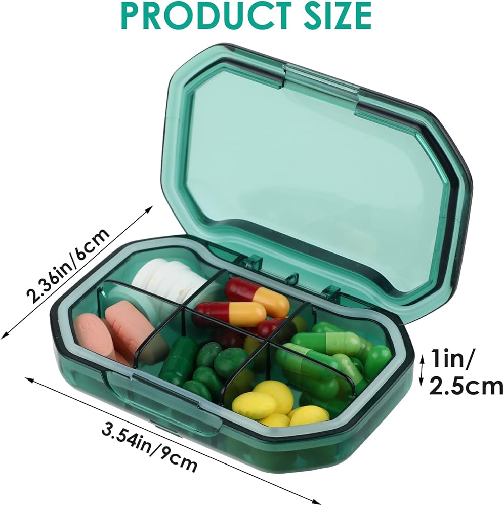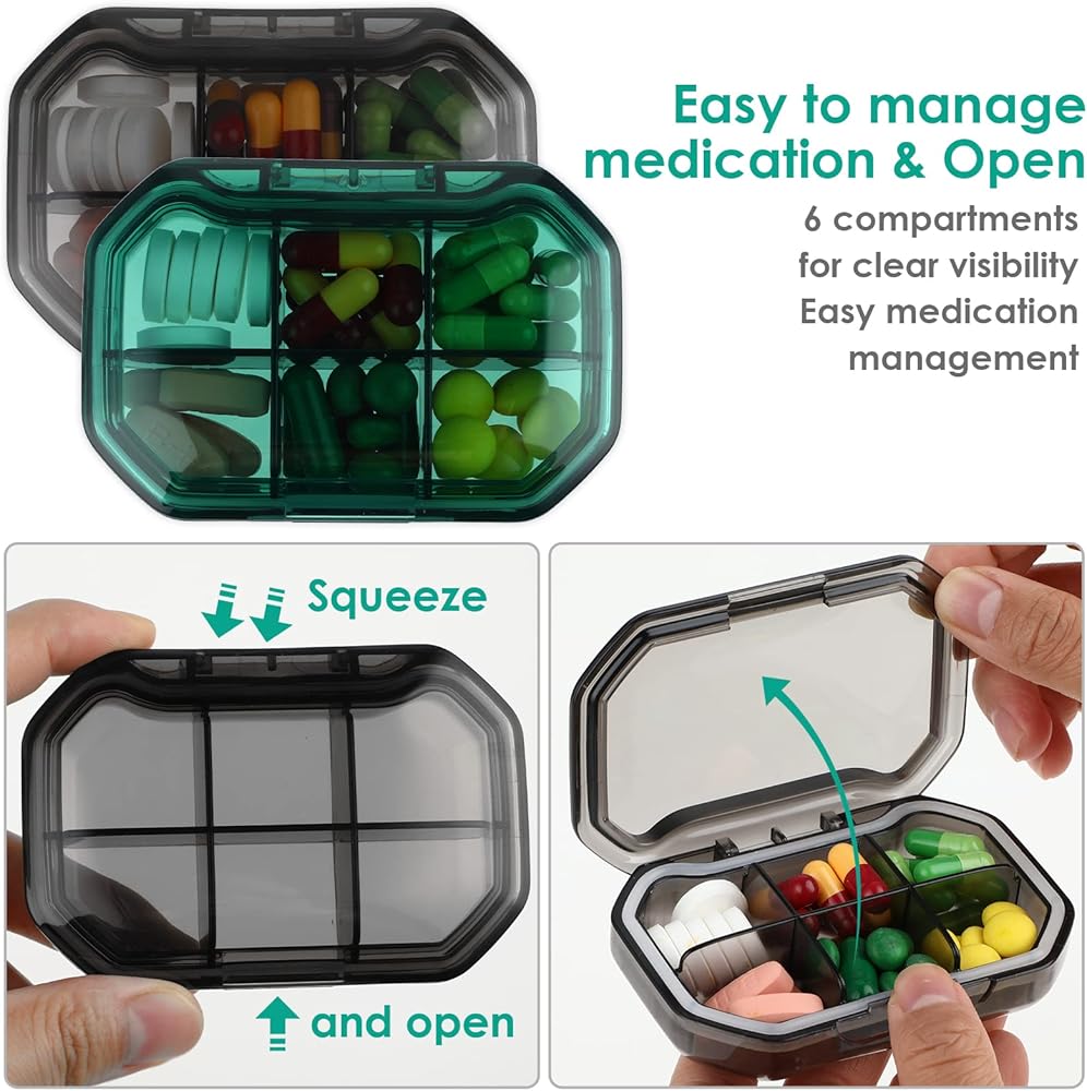 【حجم محمول】مقاس موزع حبوب الدواء 3.54 × 2.36 × 1 انش/ 9 × 6 × 1 انش، يمكن وضع منظم الأدوية في جيب البدلة. حاوية حبوب الدواء صغيرة ومحمولة، منظم أدوية مناسب للسفر والحمل اليومي.