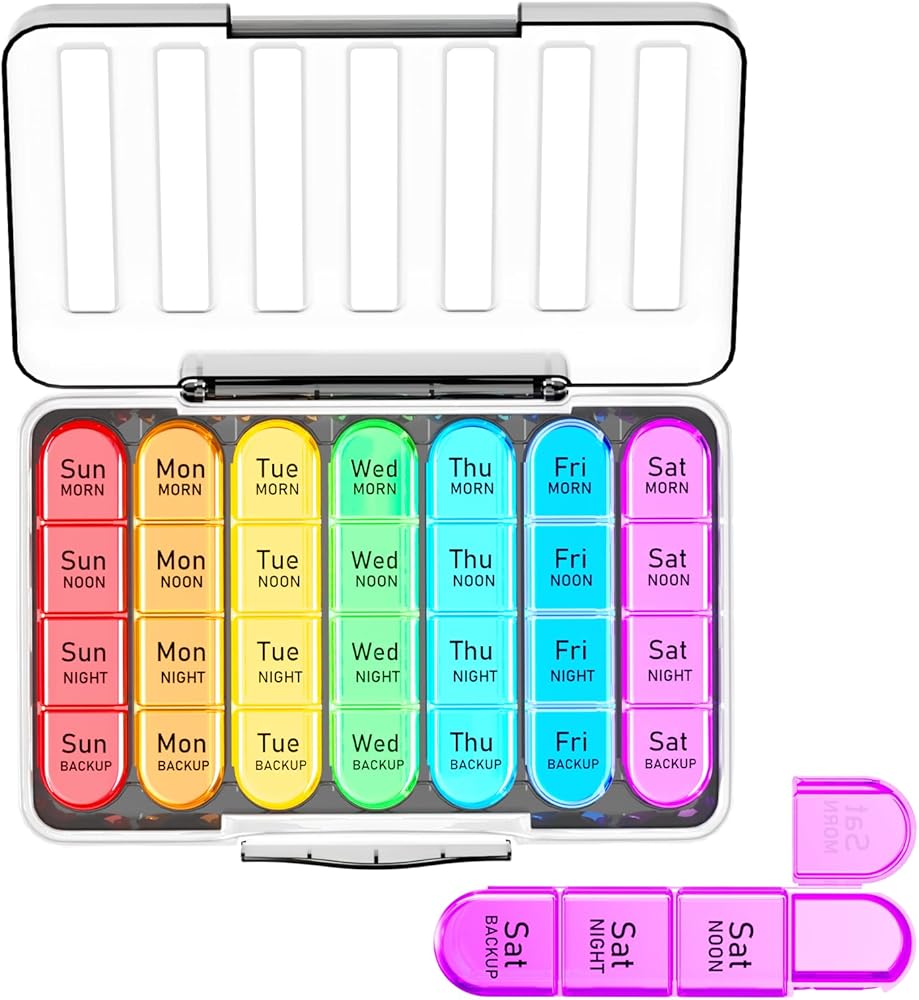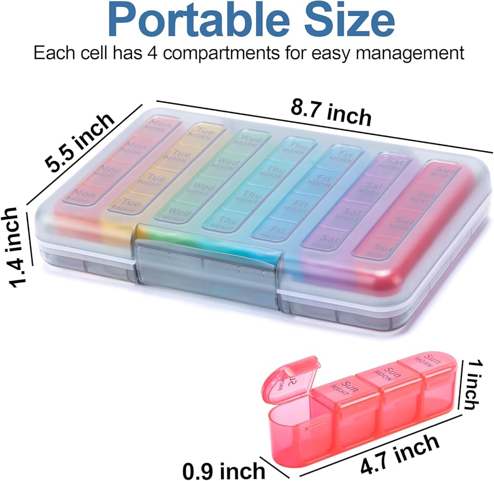 • [منظم حبوب الدواء الكبير لمدة 7 أيام] يحتوي صندوق تنظيم الأدوية على 7 صناديق حبوب فردية، كل منها يحتوي على 4 مساحات تخزين بإجمالي 28 حجرة كبيرة لسهولة التحكم.