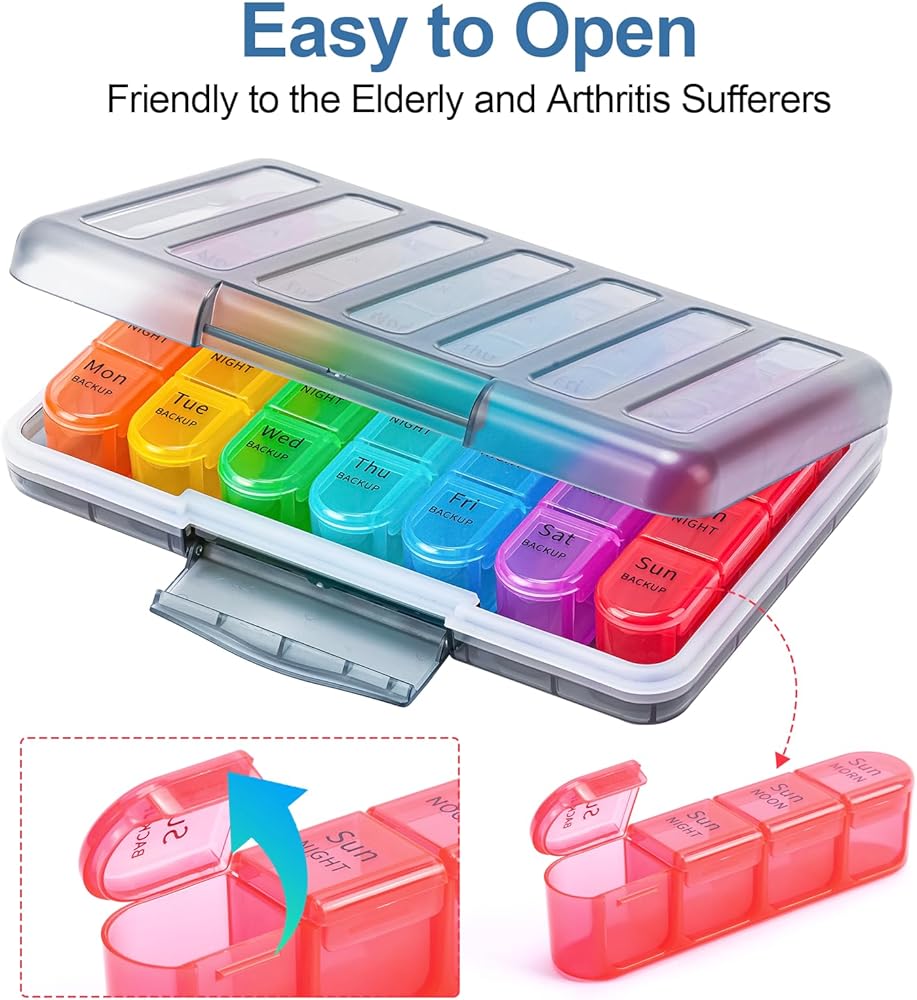 • [قفل سهل الفتح وآمن] صندوق منظم حبوب الدواء 4 مرات في اليوم سهل الفتح والإغلاق. صديقة جدًا لكبار السن أو الأشخاص المصابين بالتهاب المفاصل، تصميم مشبك الإغلاق المستقل يجعلها أكثر ثباتًا ولن تنسكب بسهولة.