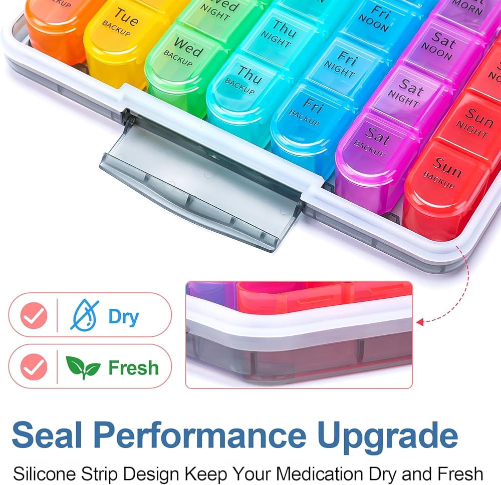 • [تصميم مطور وحماية مزدوجة] يضيف منظم حافظة حبوب الدواء الأسبوعي تصميمًا لأشرطة السيليكون للحفاظ على أدويتك جافة وطازجة. يتميز صندوق تنظيم الأدوية الخاص بنا أيضًا بتصميمات حماية مزدوجة مع أغطية خارجية وداخلية منفصلة.