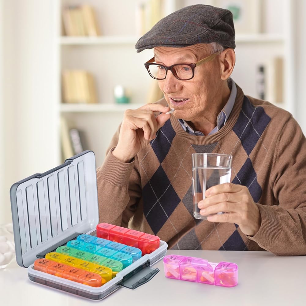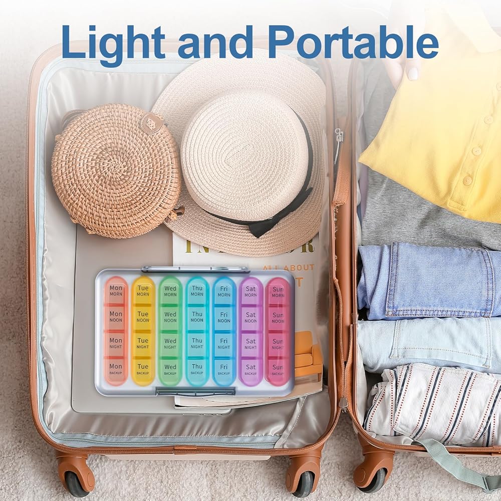 حافظة حبوب الدواء بتصميم مطور محكم الإغلاق وحماية مزدوجة. يحتوي صندوق تنظيم حبوب الدواء لمدة 7 أيام 4 مرات في اليوم على 7 صواني ملونة مع علامات يومية تساعدك على تتبع حالة استخدامك اليومي للأدوية بسهولة.