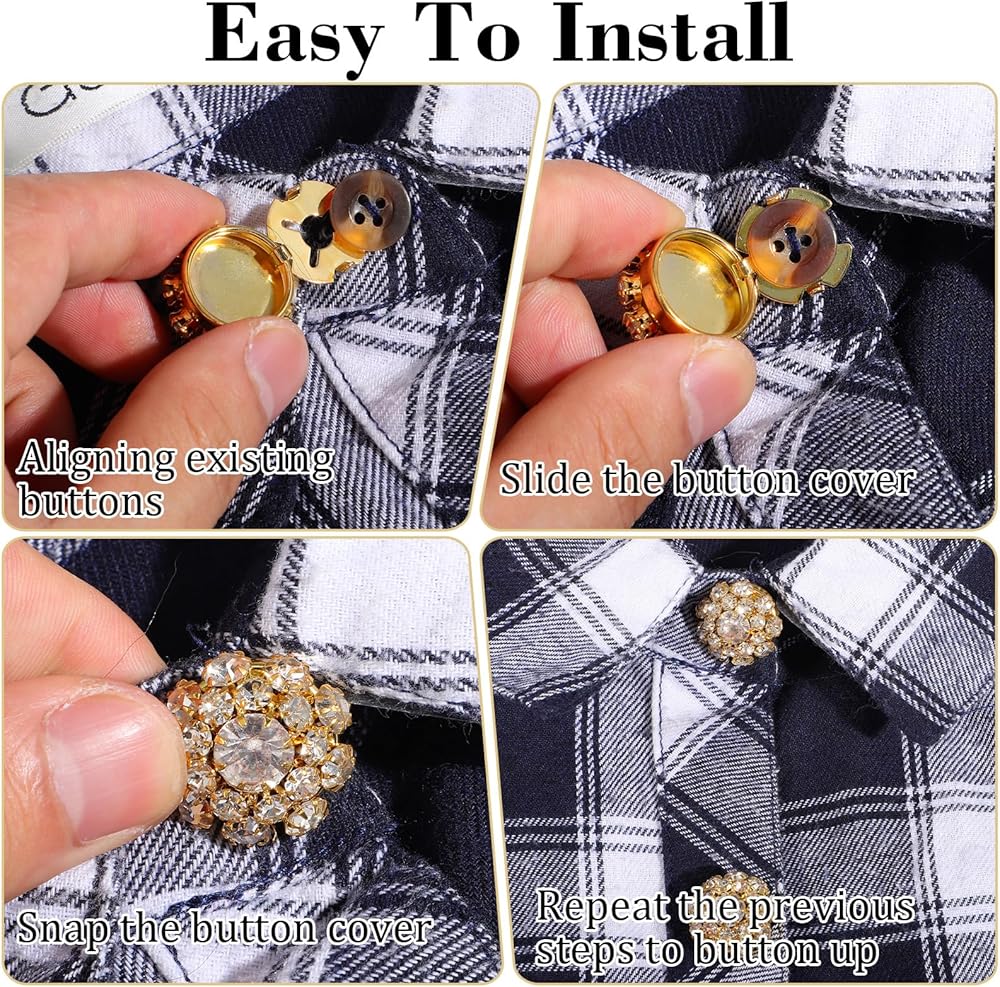 These clip-on button covers are simply attached in seconds by clipping onto existing buttons, allowing quick style upgrades and reuse across multiple garments.