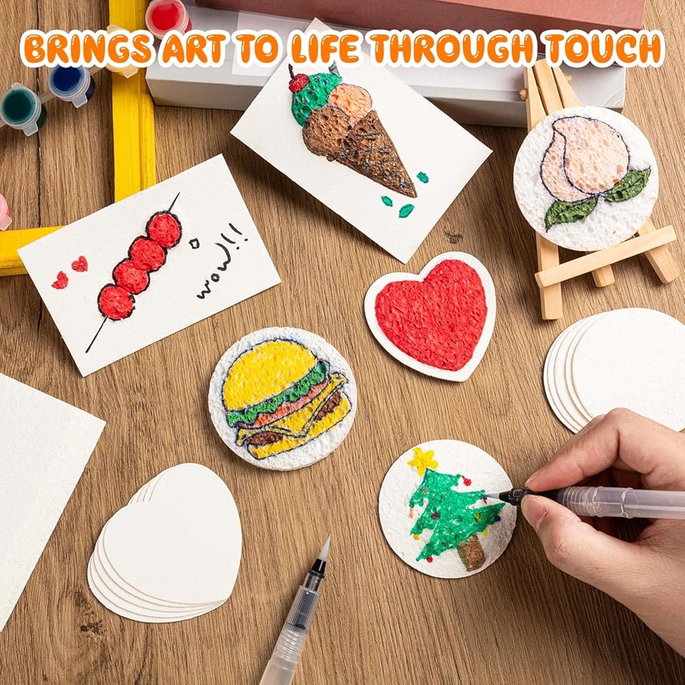Various Shapes to Inspire Creativity: The set comes with 12 circular, 12 heart-shaped, and 12 rectangular magic foam paper , along with 6 water pens and a stand. With ample quantities and combinations of different shapes, it offers endless possibilities for your creations
