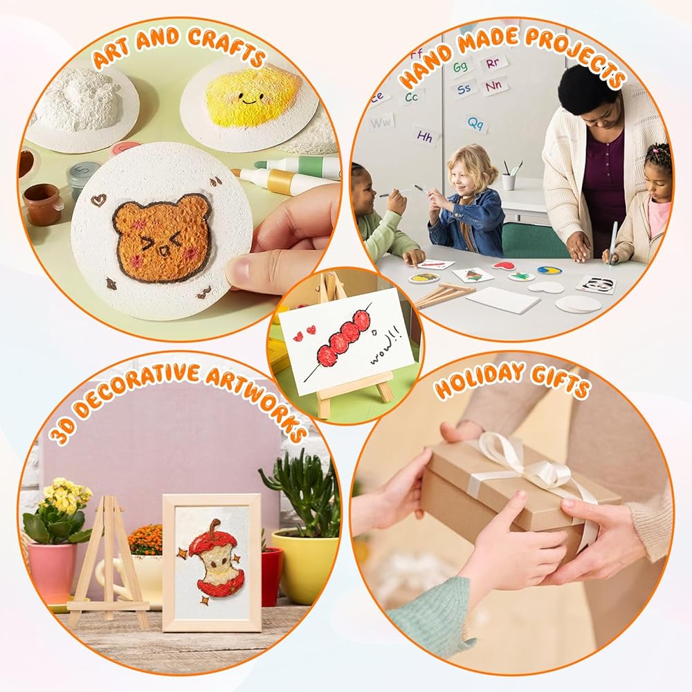 • Educational Assistant: The magic puffy paint kit is an excellent teaching tool. Children can use these foam-textured papers to make shapes such as animals and flowers, giving play to their imagination and creativity, and improving their hands-on ability