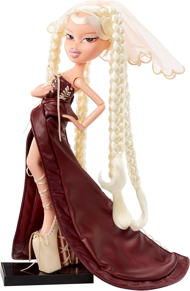 Bratz wants to celebrate with you! Say cheers, cuz' Kool Kat is pulling up to the party— the ultimate trendsetter with a whole lotta' bratitude and even more gratitude for all the years of stylin' looks and fierce friendship. Celebrate the Bratz 24th anniversary with the Bratzaversary Collection doll. The limited-edition Bratzaversary Doll is dressed to impress in a middle slit, maroon, leather gown with champagne lace-up details. Jade never forgets to accessorize! She wears champagne colored platform heels with lace up detailing, a helix ear piercing, and a blusher veil. She rocks two stunning pairs of platinum blonde braids paired with a soft, wavy strand-bang. Her makeup is a snatched yet subtle, featuring a low-contrast glam look with a pale, pink lip and thin brows.