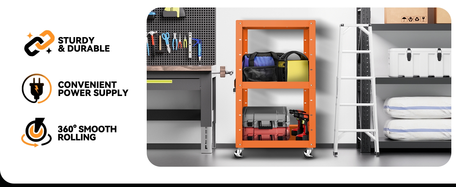 【وصف المنتج】 عربة تخزين مع شريط حصيرة غير قابلة للانزلاق وشريط الطاقة المدمج ، يمكن أن توفر حلًا متعدد الأغراض والحفاظ على بيئة عمل آمنة ، لتعزيز مساحة العمل.