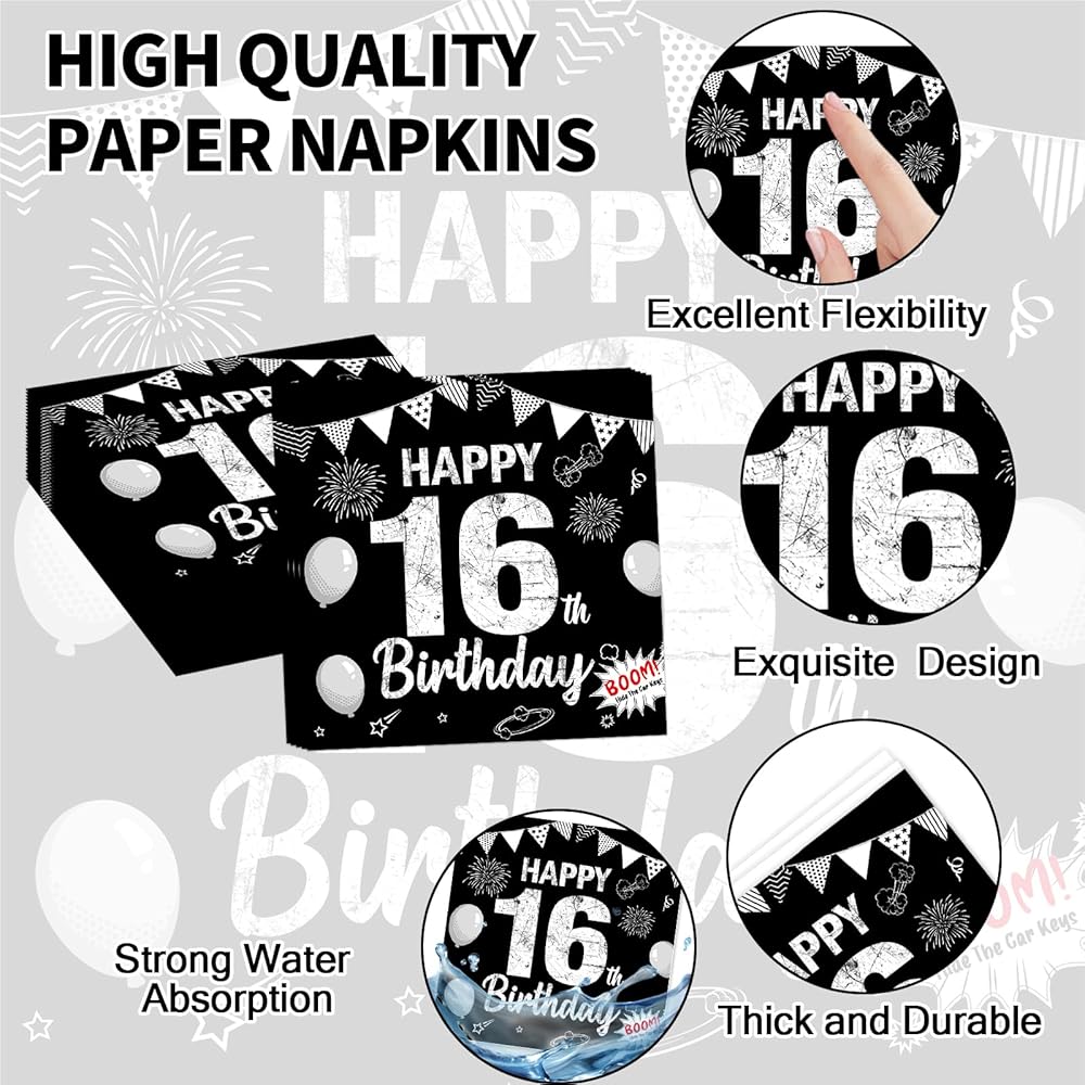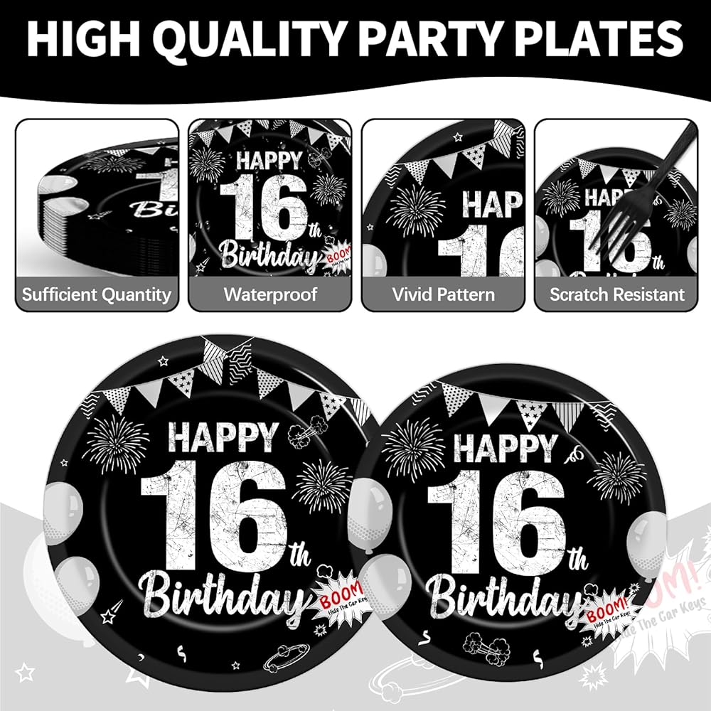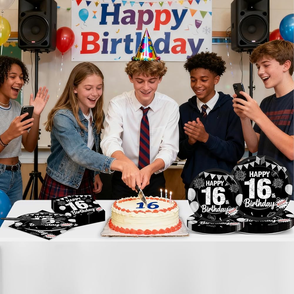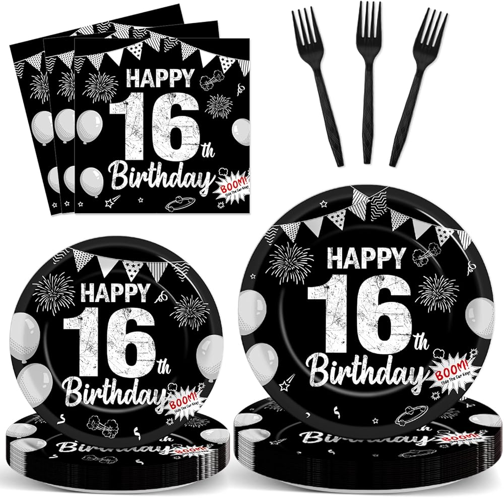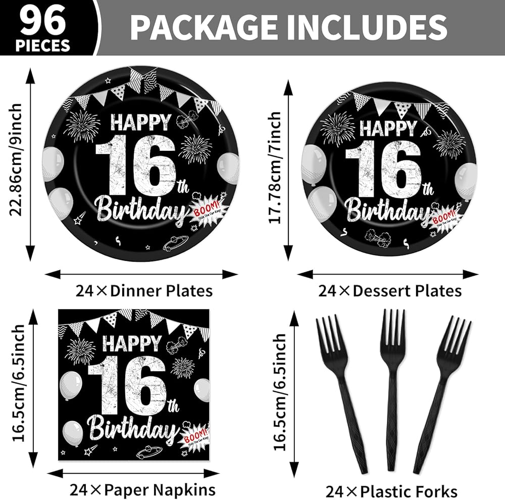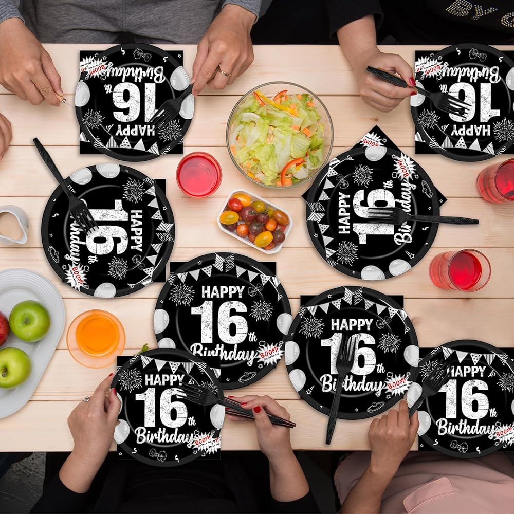 مجموعة من 96 قطعة من الأطباق الورقية والمناديل والشوك لحفلات عيد الميلاد السادس عشر باللون الأسود الحلو بعمر 16 عامًا، أطباق ورقية للحفلات للاستعمال مرة واحدة، مجموعة حفلات سعيدة 16 لتزيين حفلات أعياد الميلاد للأطفال