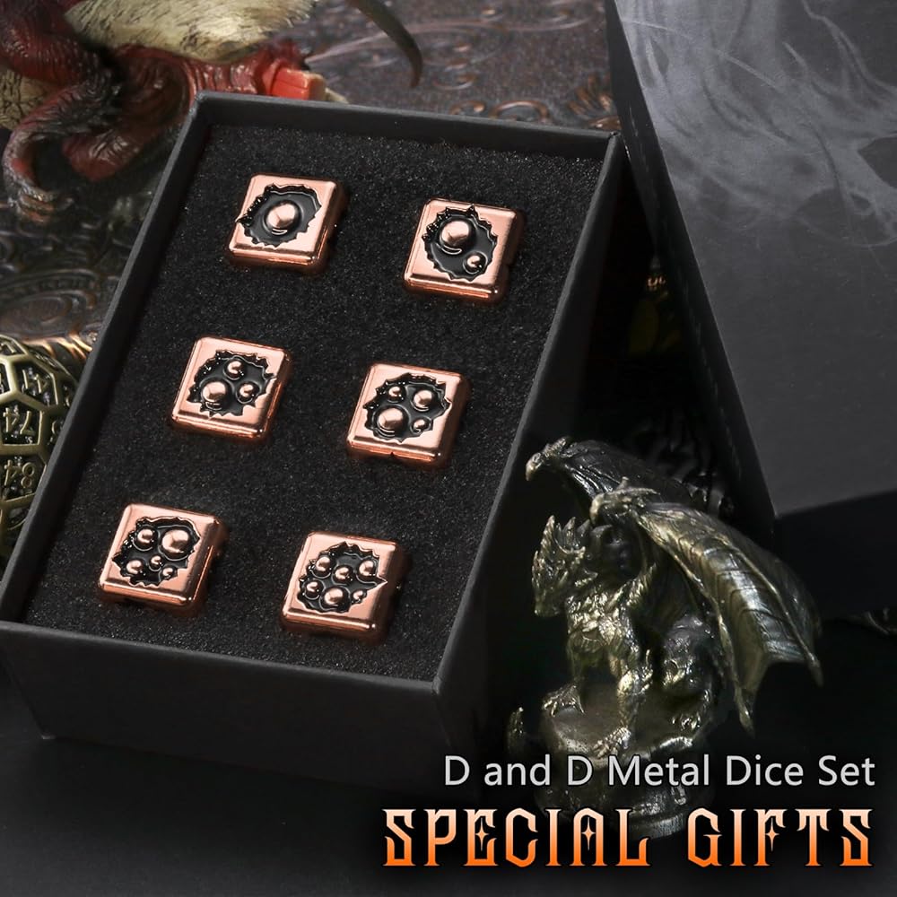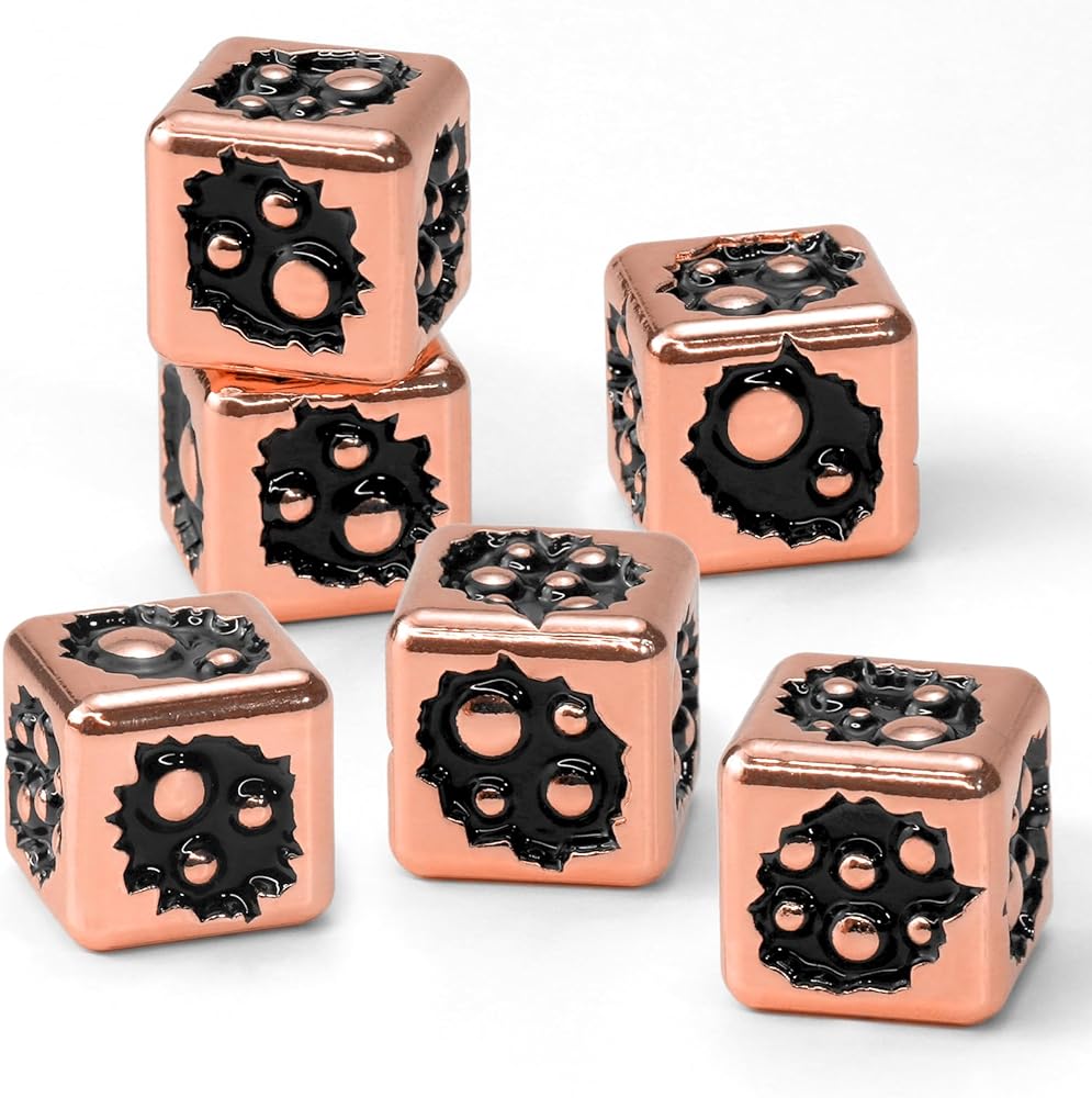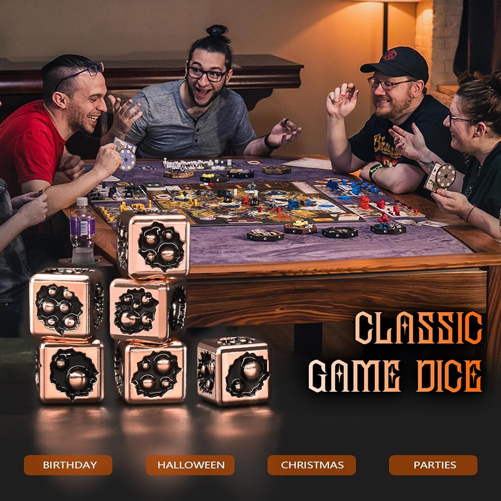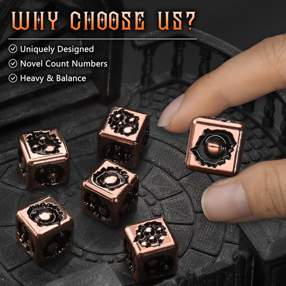 مجموعة الزهر المعدنية : تم تصميمها من المعدن عالي الجودة ، هذه الزهر الـ 6 جوانب توفر شعورًا ثقيلًا بالمرض. متينة بما يكفي لتحمل عدد لا يحصى من لفات ، وهي مصممة لتكون رفيقًا طويلًا دائمًا لجميع آر بي جي ومغامرات الطاولة