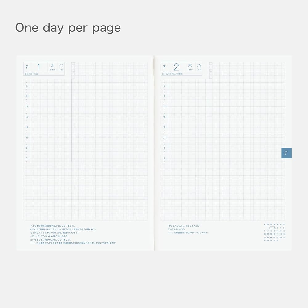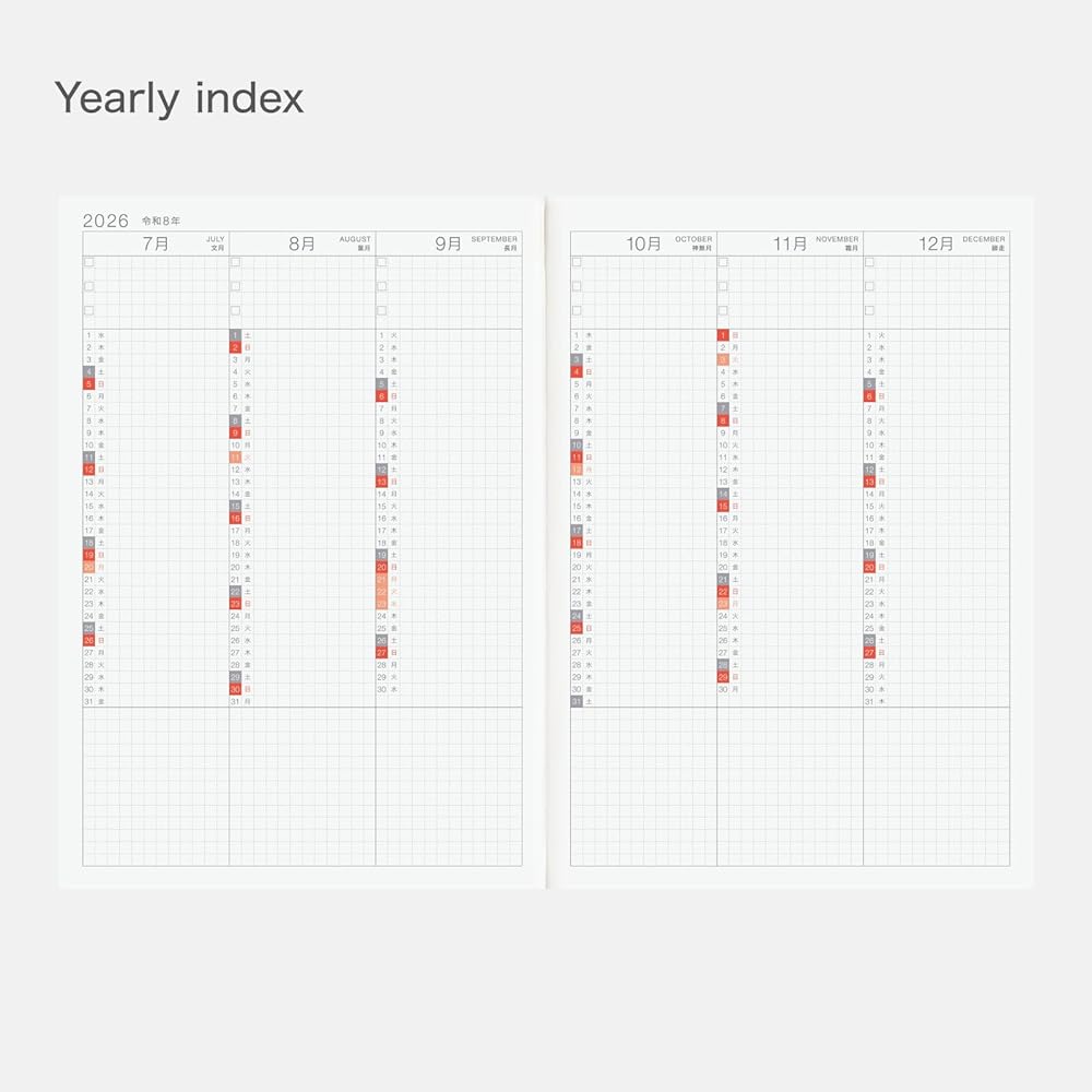 A5 size × 2 books (Each: 210 x 148 x 10 mm / 8.3" x 5.8" x 0.4"); approx. 260g per book; 288 pages each; Japanese. Tomoe River paper. 3.7mm graph paper; Monday-start week.