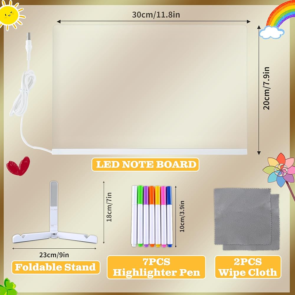LED Note Board مع ألوان ، لوح محو جاف الأكريليك مع الضوء ، 2025 لوحة الرسم LED متوهجة للأطفال ، لا تقود على متنها مع حامل و 7 علامات ملونة للمنزل Office ، 11.8 "× 7.9"