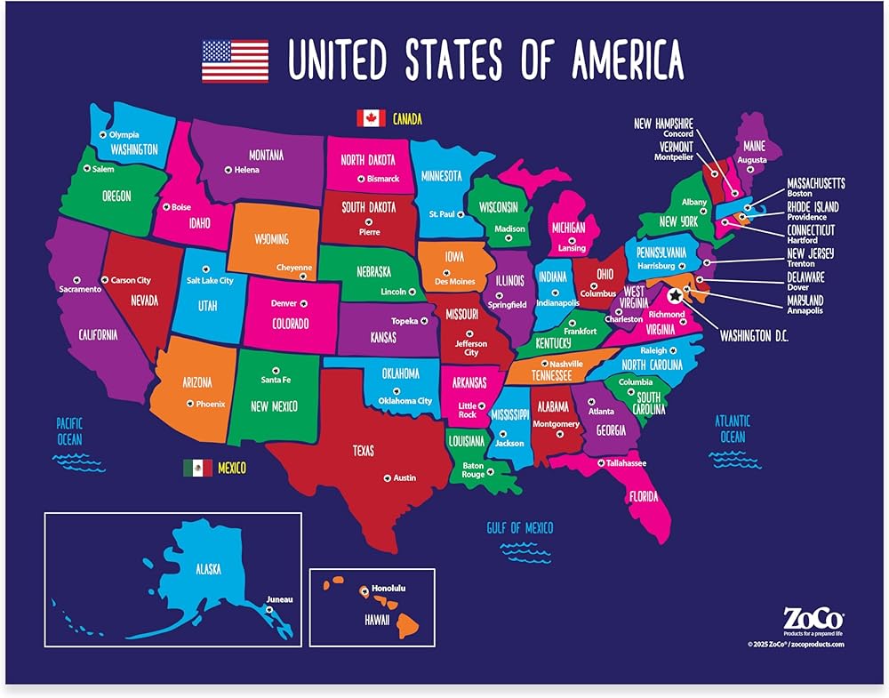 تم تصميمه للتعلم المرئي-تخطيط مشرق وملون وخطوط صديقة للأطفال يسهل على الطلاب تحديد وتذكر الولايات الأمريكية والعواصم في لمحة.