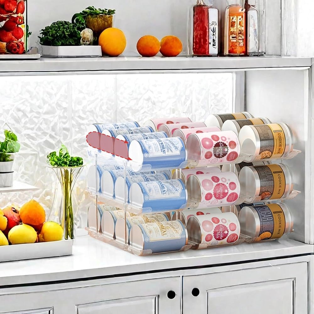 Can Organizer for Pantry ، 3 مجموعات 3 مستويات يمكن مخزن التخزين منظم ، منظم علبة الصودا لثلاجة 36 علب رف منظم الطعام القابل للتكديس ، Clear Clear