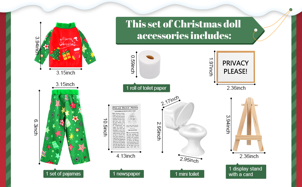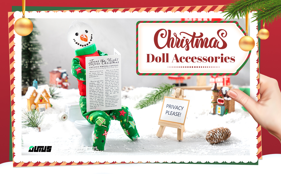 إكسسوارات دمية عيد الميلاد: هناك مجموعة من ملحقات دمية عيد الميلاد ، بما في ذلك مجموعة من بيجاما ، ومرحاض صغير ، وصحيفة ، وموقف عرض مع بطاقة ولف من ورق التواليت ؛ مع عيد الميلاد قاب قوسين أو أدنى ، نقدم الملحقات لدميتك لملء منزلك بهتتف احتفالي