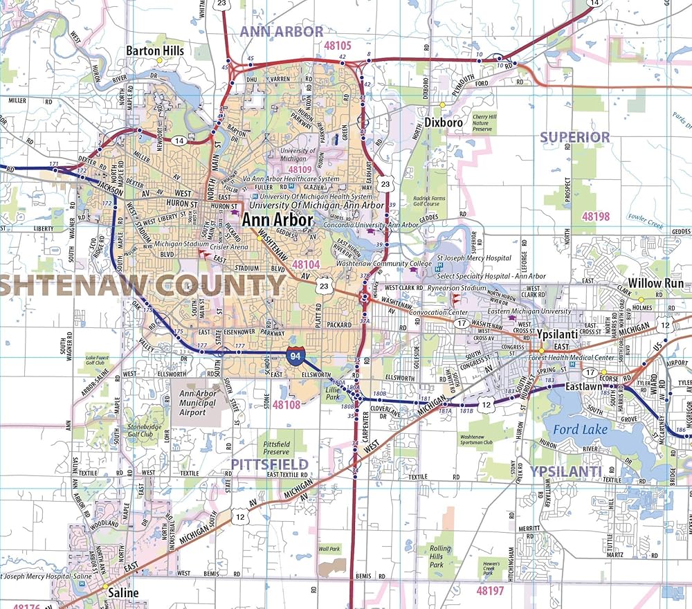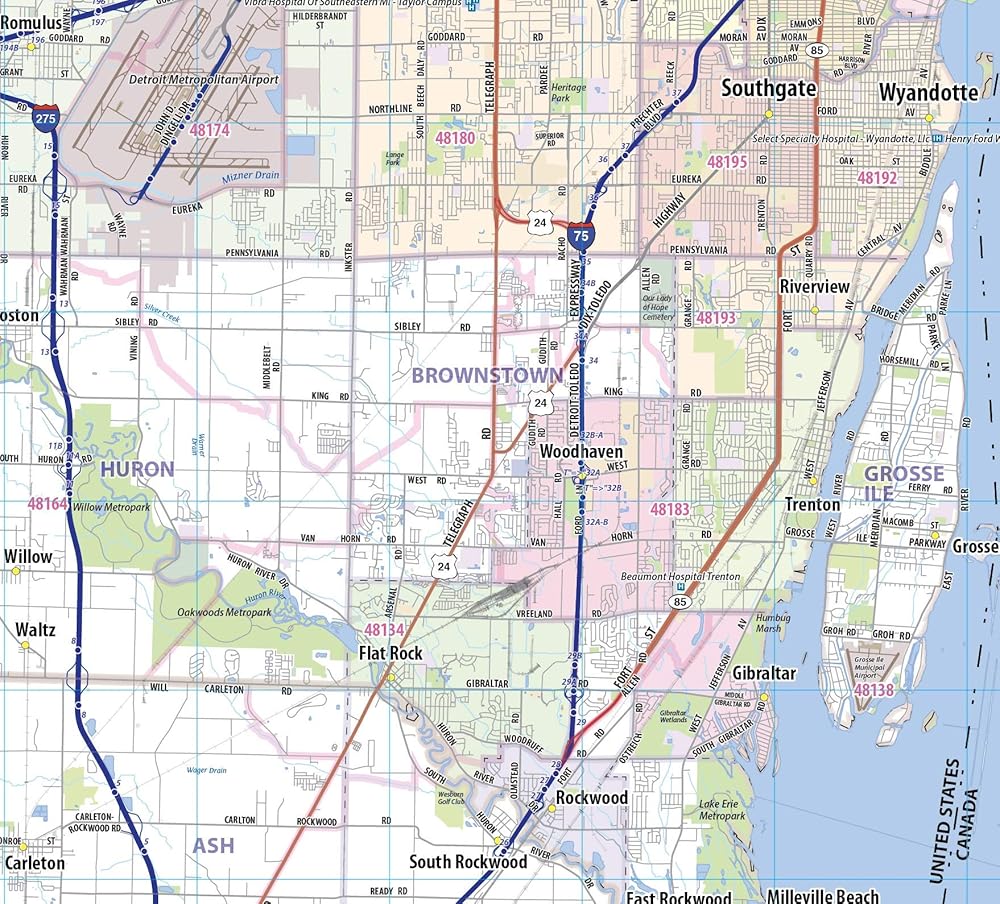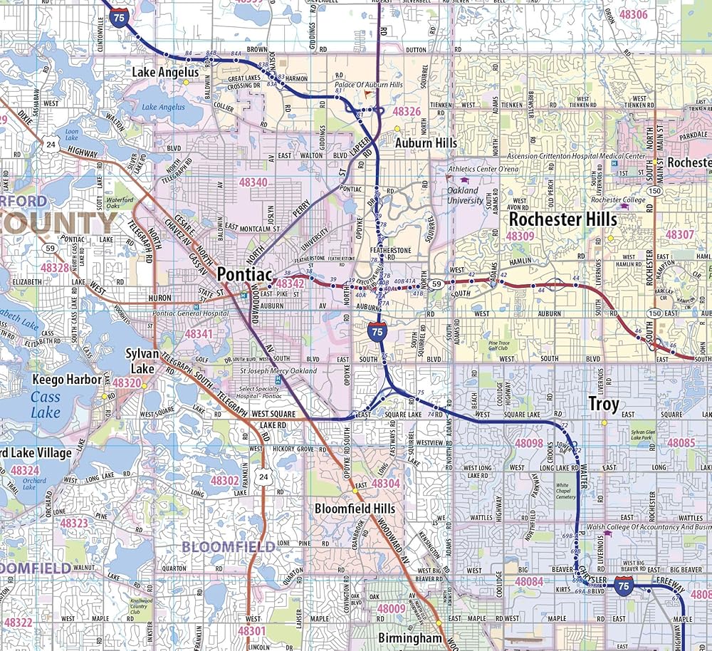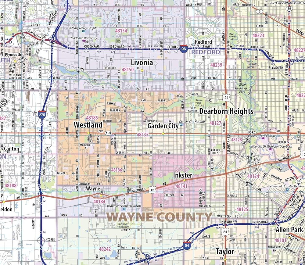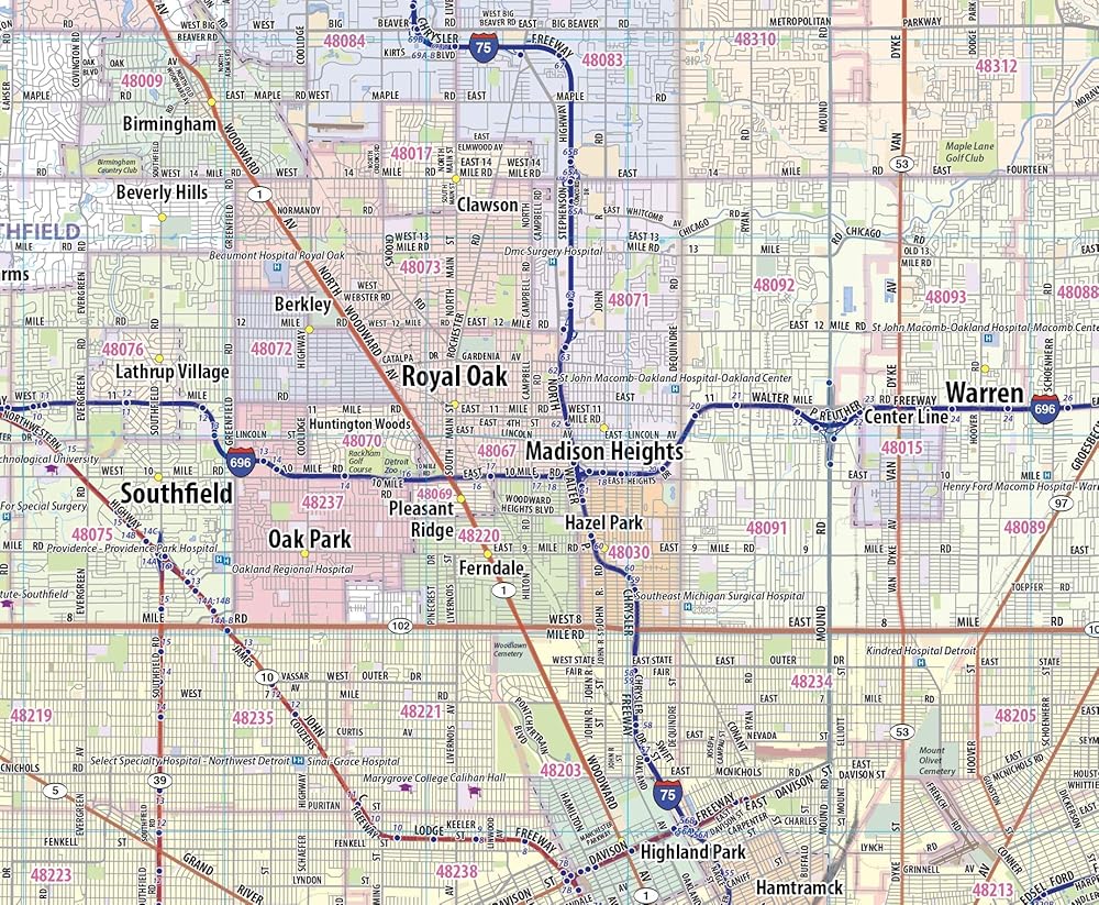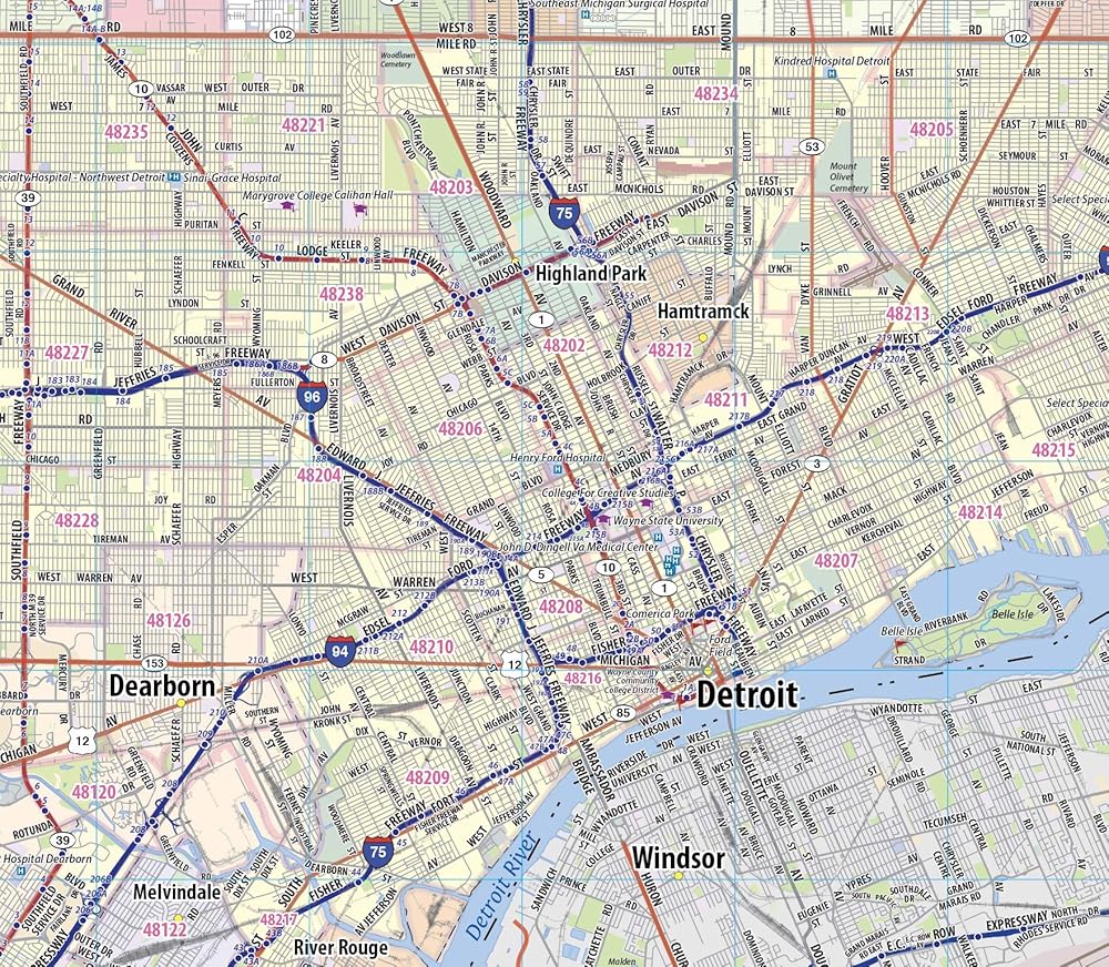 Laminated wall map of the Greater Detroit Metro area showing locations within 30 - 40 miles of downtown Detroit, including all of Wayne County, Oakland County, Macomb County and parts of Livingston, Washtenaw, Monroe, and Genesee Counties. Communities include Detroit, Dearborn, Ann Arbor, Warren, Royal Oak, Taylor, Pontiac, and Troy, among others. Features shown include cities, towns, major roads and highways, zip codes, and major points of interest. An index of community names is included. The laminated map is rolled and shipped in a tube.