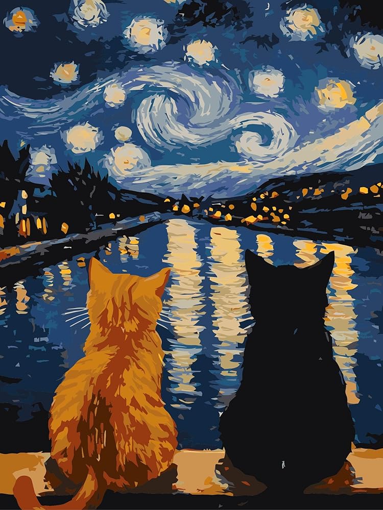 مجموعة طلاء القطط بالأرقام من RYMILIE للبالغين المبتدئين والأطفال من سن 8 إلى 12 عامًا مع أكريليك سهل غير مؤطر على القماش مقاس 11.8 × 15.7 بوصة مع دهانات وفرش، طلاء ليلي مرصع بالنجوم بالأرقام كهدية لتزيين حائط المنزل