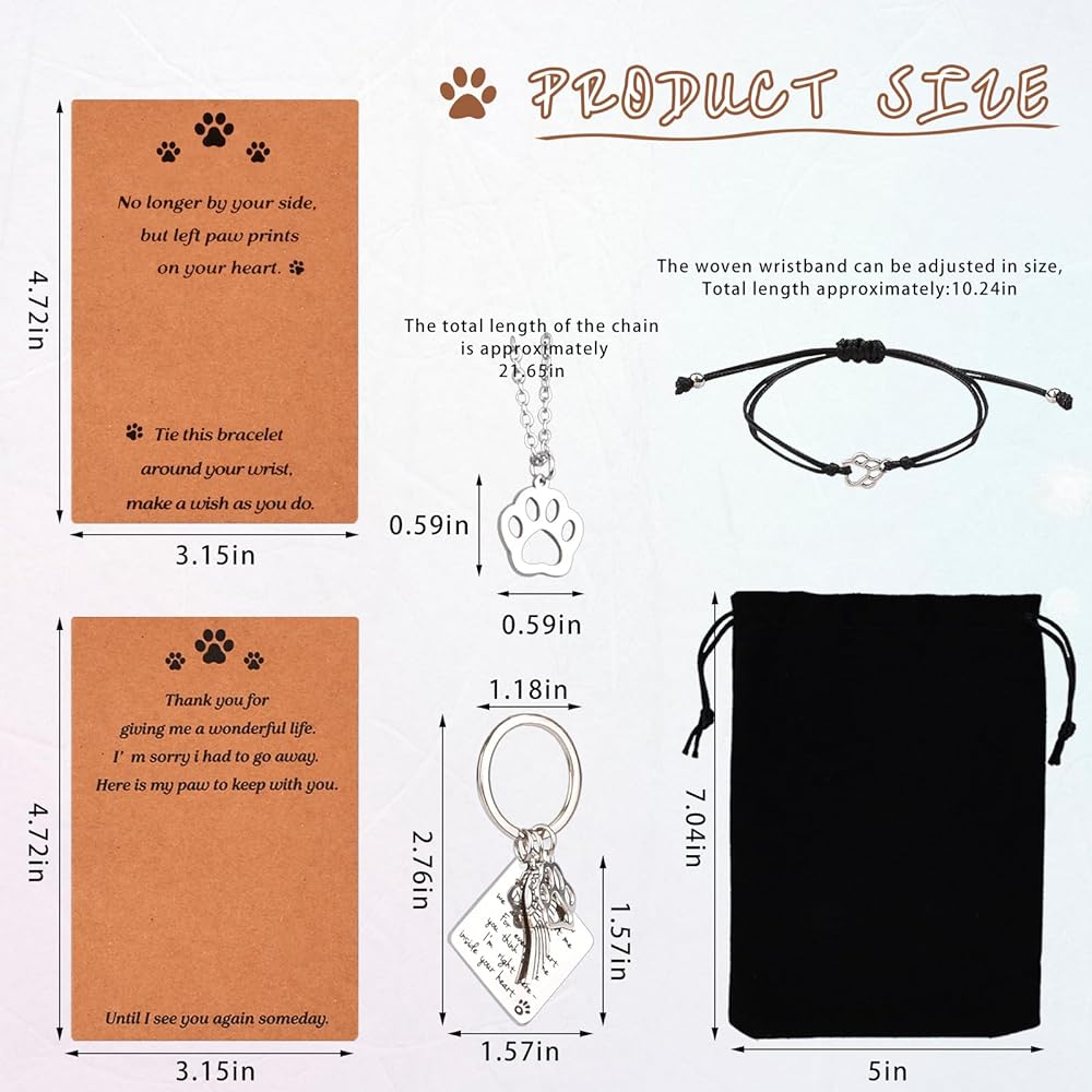Inside the package: 2Pcs paw prints adjustable bracelet, 2Pcs paw prints necklac, 2Pcs keychain with angel wings paw prints and commemorative plaque,(bracelet length 16-30cm, made of nylon rope and alloy, necklac and keychain made of alloy.)They come in a black flannel bag with 3 cards.