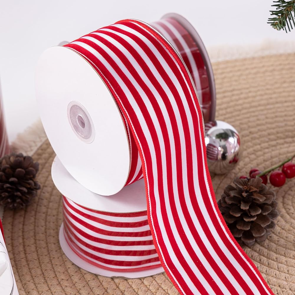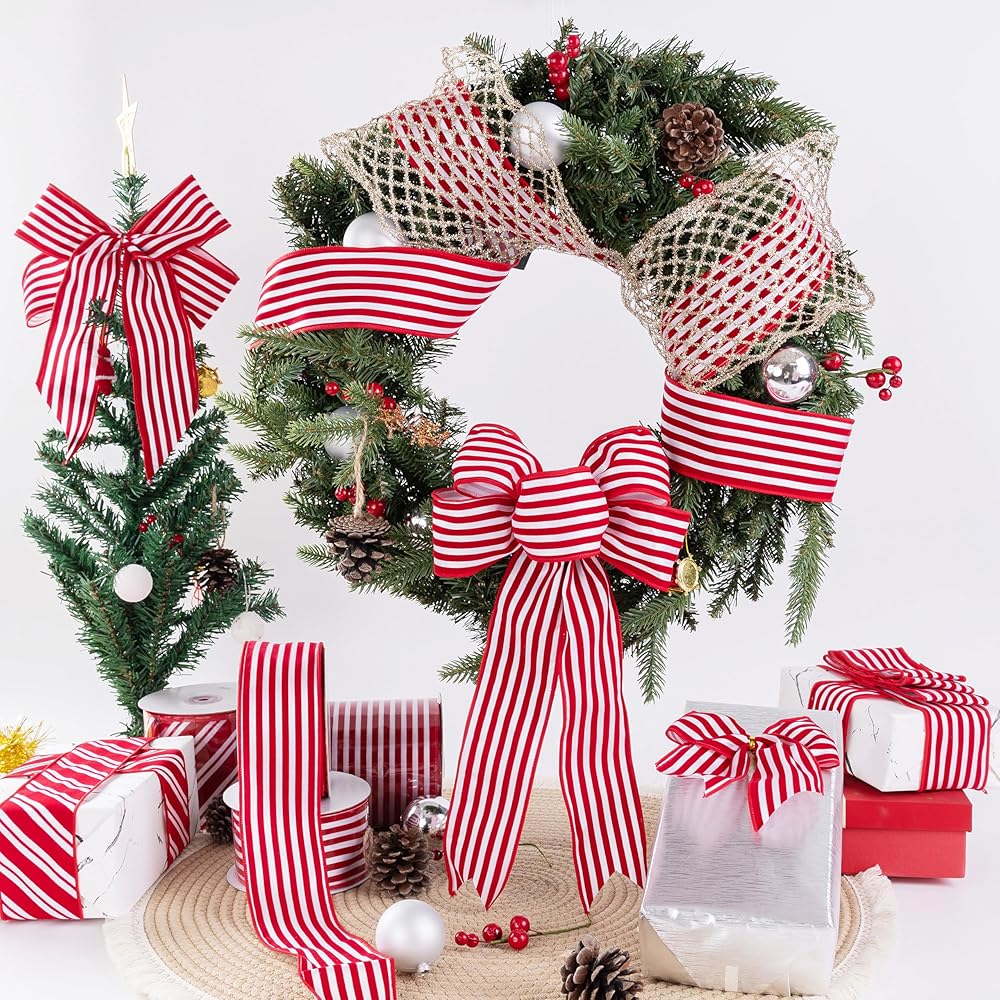 MULTIPLE USES: Use this ribbon to tie gifts, make wreaths, garlands,Decorate staircases, railings, tables, chairs, candles or make a big bow for a perfect tree topper- the versatile red and white stripes add holiday cheer to any decoration or craft.