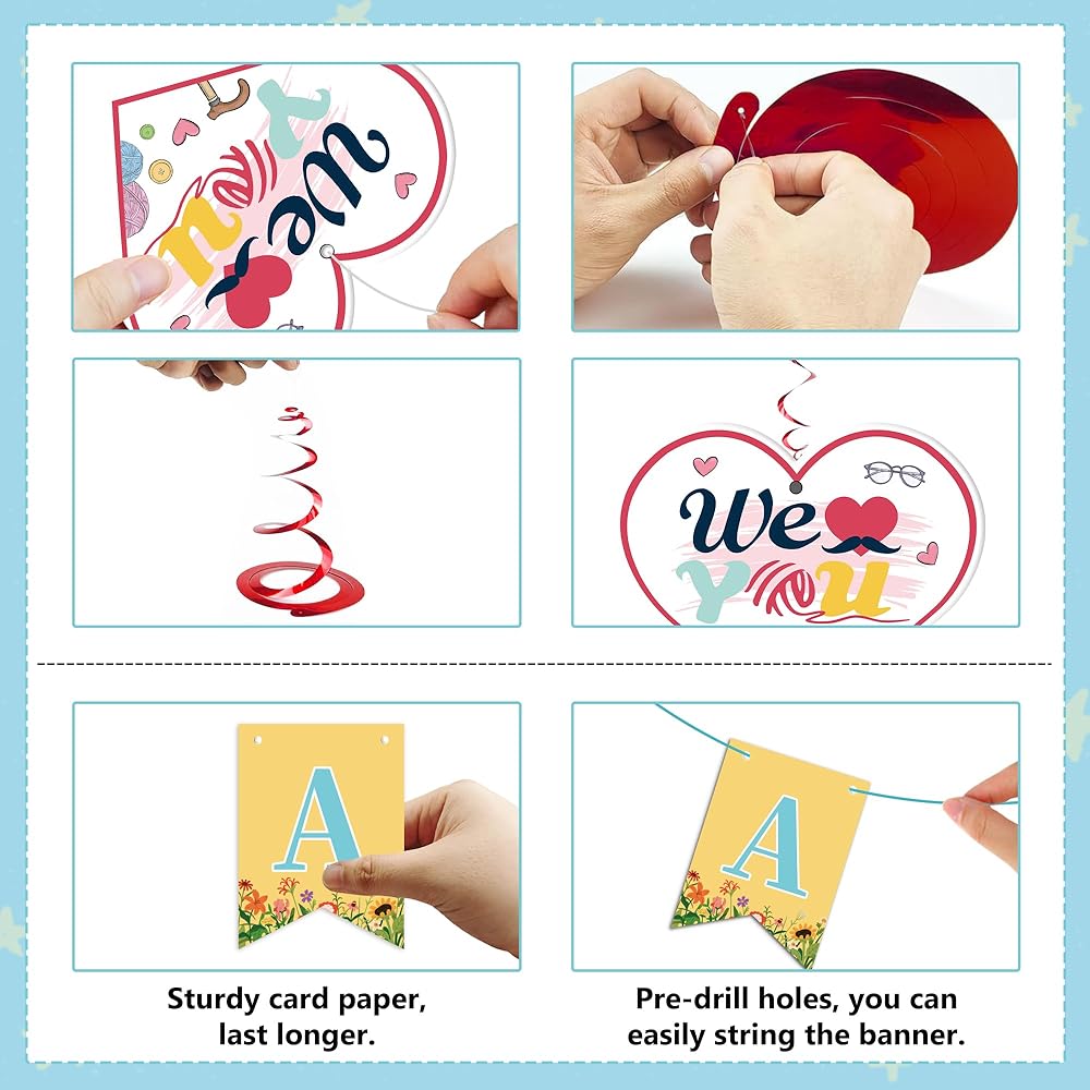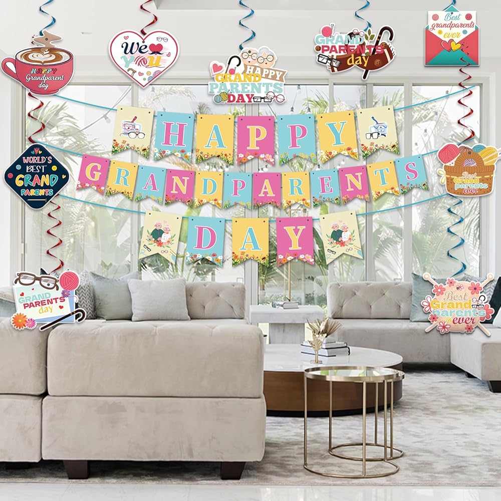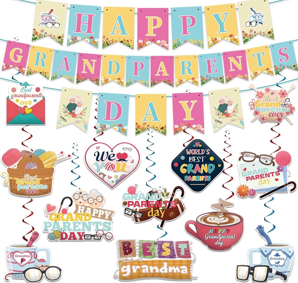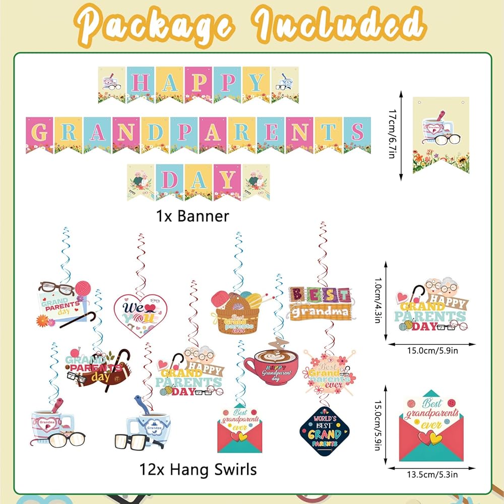 Package Includes: You will receive a well-designed happy Grandparents Day decorations banner, and 12pcs hanging swirls. These products are skillfully integrated with many classic elements of Grandparents' Day, such as woolen balls, walking sticks, etc