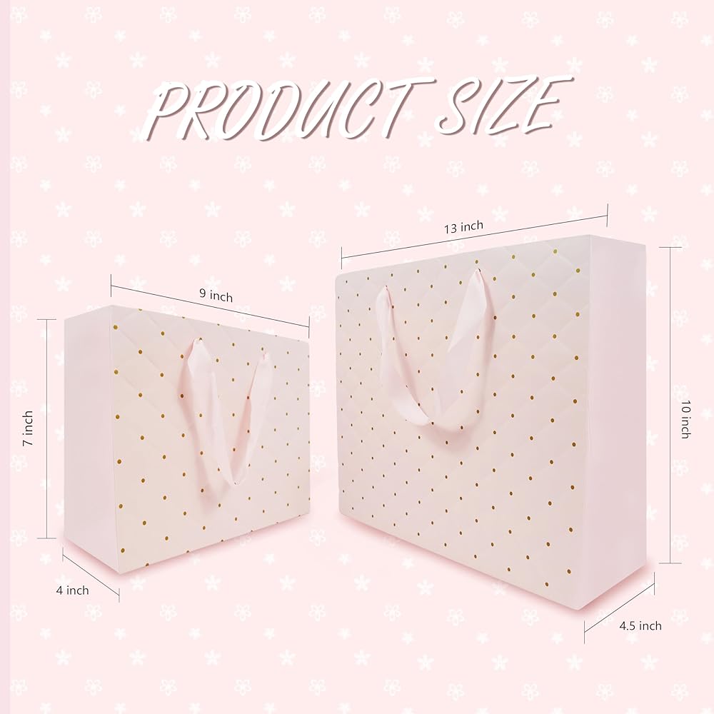 أكياس الهدايا ذات الألوان الزاهية هذه مع مقابض مقاييس 13 'x 10' 'x 4.75' و 9 'x 7' 'x 4' 'على التوالي. أنها تستوعب أبعاد الهدايا المختلفة. من الحلي الصغيرة إلى عناصر الهدايا الكبيرة.