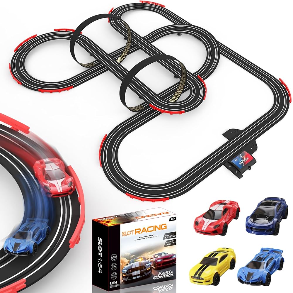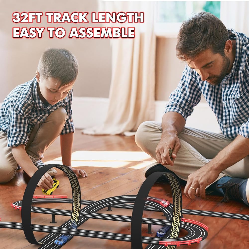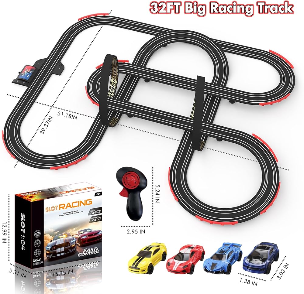 مسار سباق Slot Racing Car مسار 32 قدمًا تعمل بالركض الكهربائي للأولاد والأطفال ، والسباق المزدوج مع 4 سيارات عالية السرعة ووحدات تحكم يدوية ، ولعب الهدايا للأطفال 6،7،8 سنة