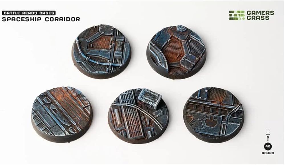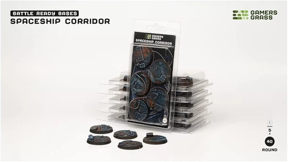 This blister contains 5 thermoplastic 40mm wide round Battle Ready Bases, in a Spaceship Corridor theme.