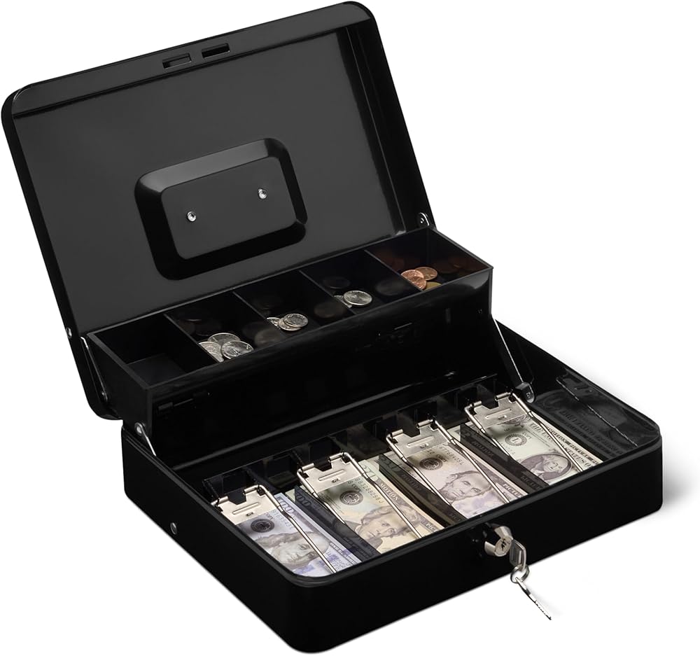 - Cash box for holding and organizing money; ideal for craft shows, garage sales, or small businesses