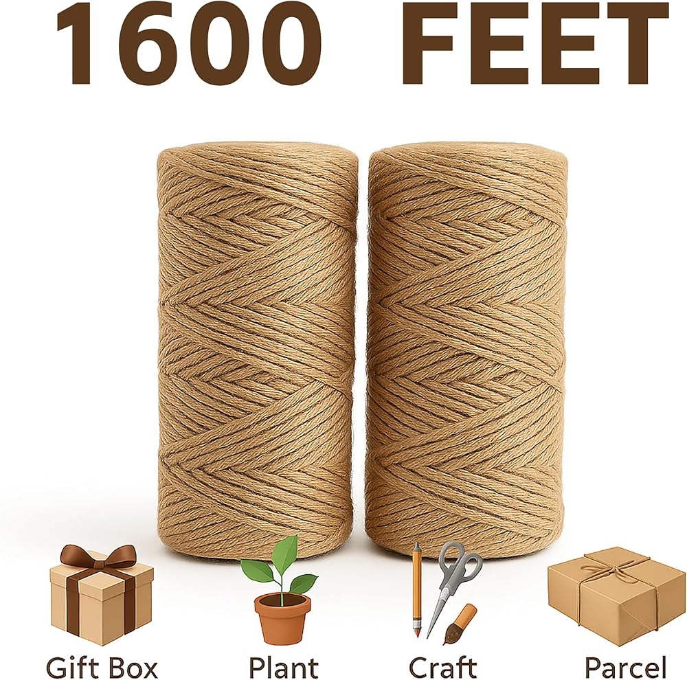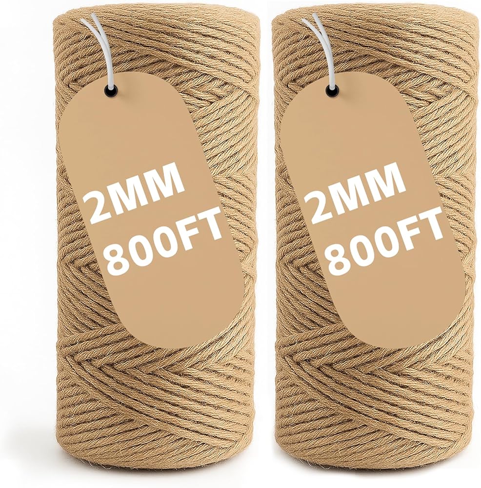 2 Pack Natural Jute Twine, 2mm Thick, 1300 Feet Total (650 Feet/Roll), Brown String for Crafting, Gardening, Gift Wrapping, Macrame, DIY Home Decor