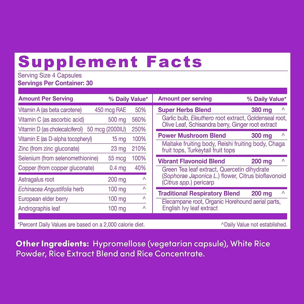 دعم المناعة على مدار العام: تحتوي زجاجة الإمداد لمدة شهر واحد على 120 كبسولة ممتازة لدعم المناعة خالية من الغلوتين وخالية من الصويا والباليو وكيتو ومصنوعة في الولايات المتحدة الأمريكية.