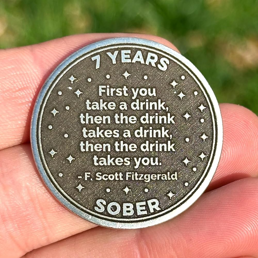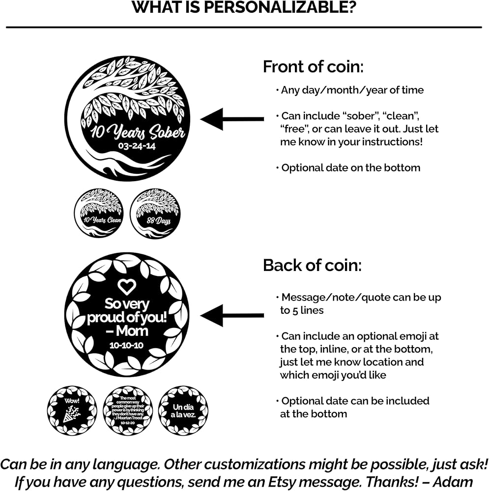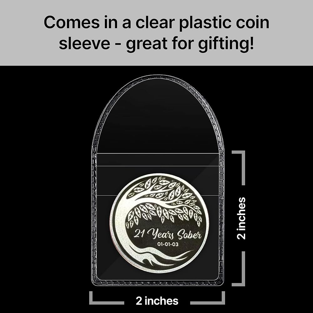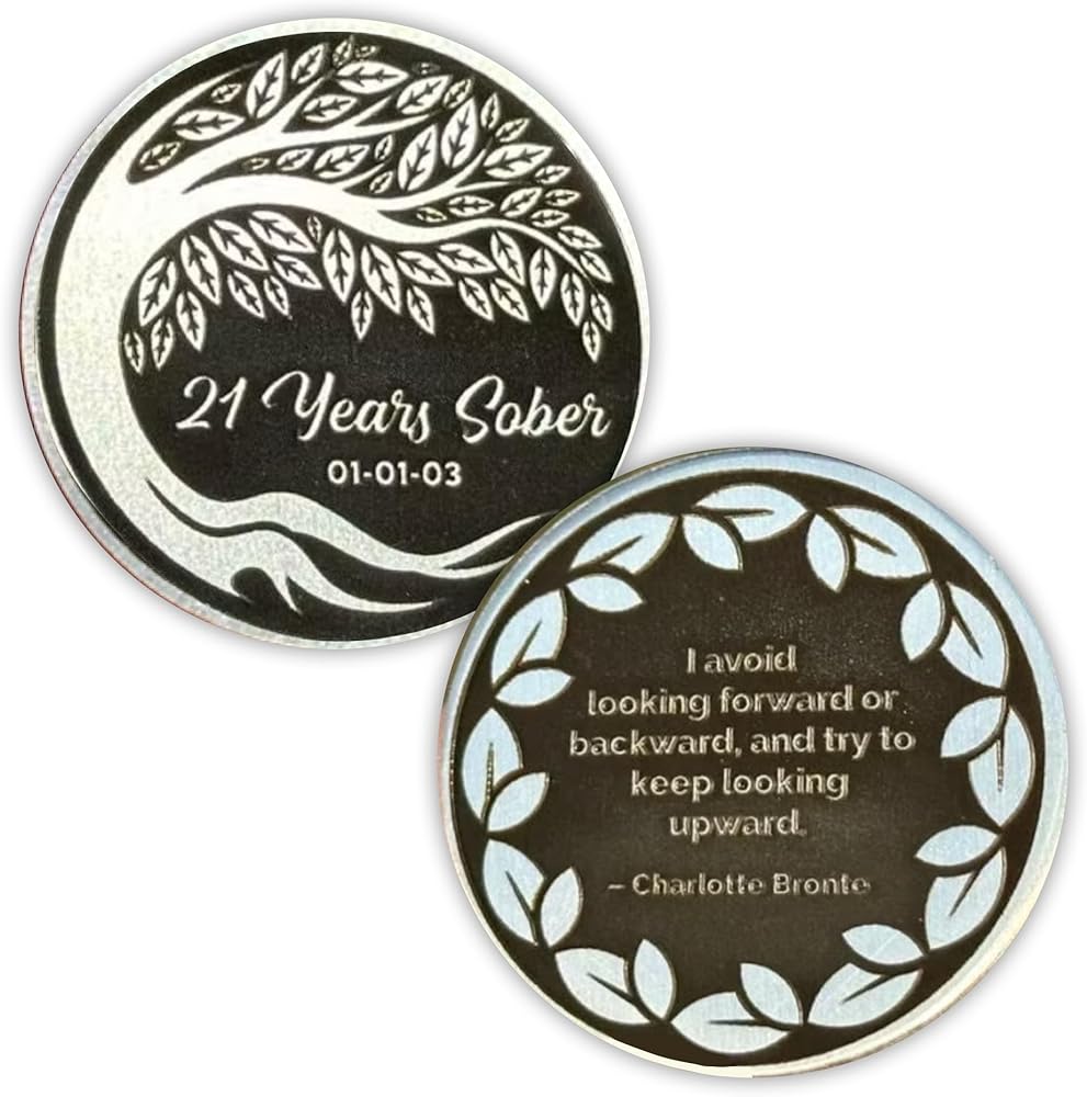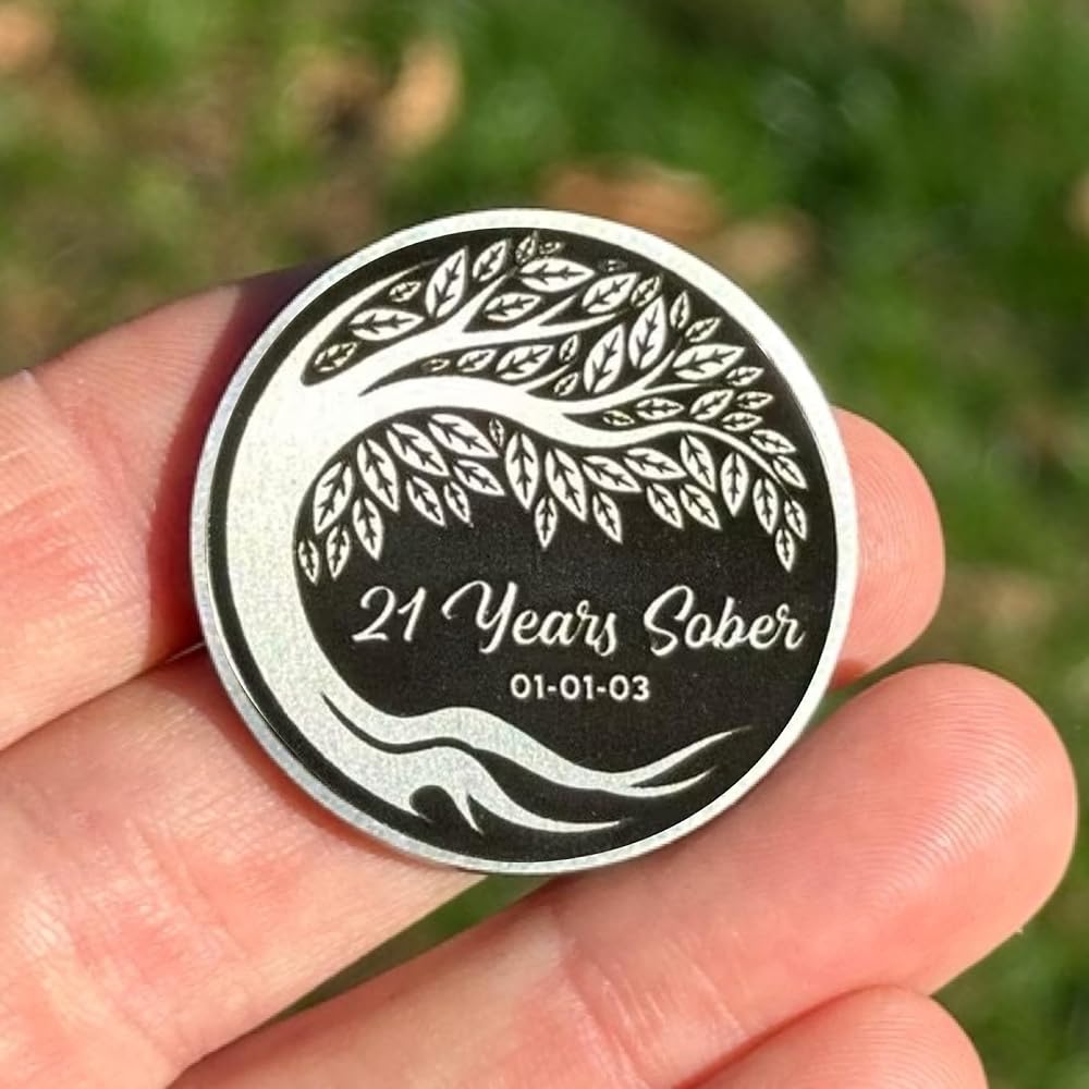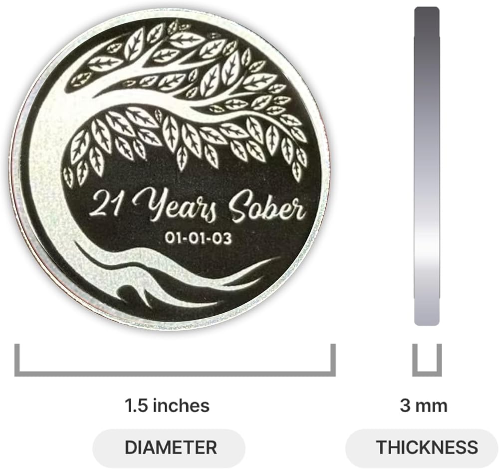 Celebrate every milestone on your recovery journey with The Achieve Mint's personalizable black and silver sobriety coin, expertly handcrafted in Charlotte, NC. This custom sobriety chip features a striking antique silver finish and an intricate Tree of Life mandala design, symbolizing growth and resilience. Measuring 1.5 inches in diameter and 3mm thick, this sobriety chip offers a substantial feel and premium quality, making it a meaningful keepsake for yourself or a loved one. Ideal for marking important anniversaries, whether it's a 1year, 2 year, 3 year, 4 year, 5 year, 6 year,7 year, 8 year, 9 year, 10 year, 14 year, 20 year sobriety coin and more. Any day, week, month or year you need. This customizable medallion is perfect for those seeking personalized non-AA or AA medallions or sobriety coins for men and women. Include a date, message, or quote on the back to inspire continued commitment and hope, making it a thoughtful gift for anyone on the path to wellness. This sobriety chip is more than a token—it's a symbol of perseverance and a daily reminder of your achievements.