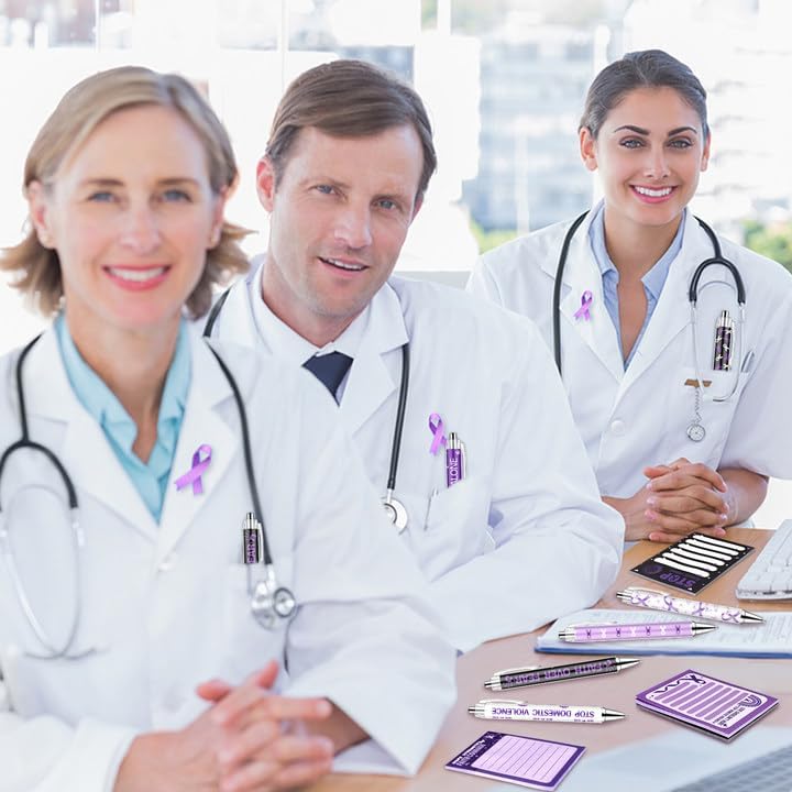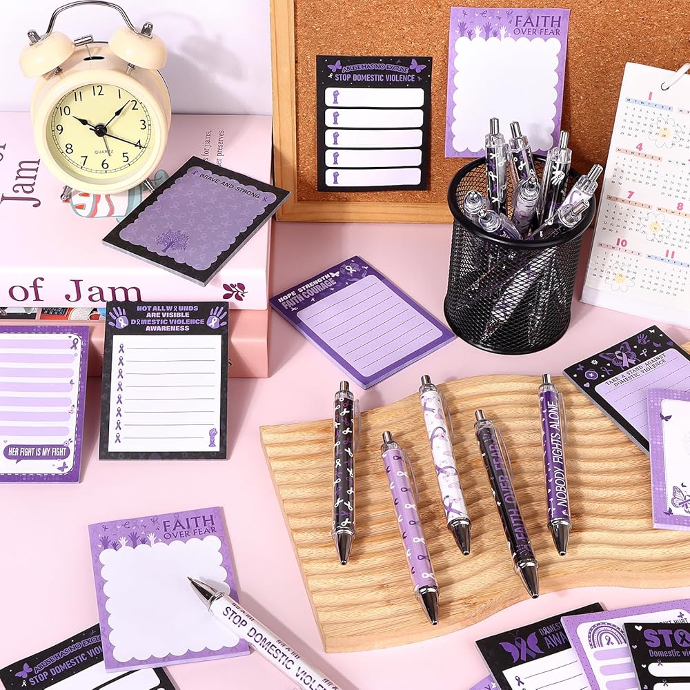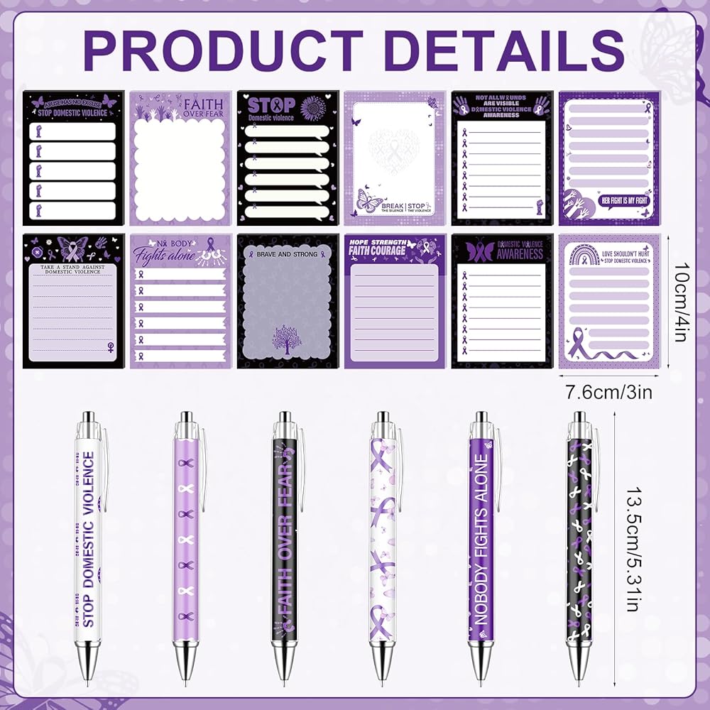 ◆meaningful designs: each notepad and pen showcases powerful domestic violence awareness messages and purple ribbon motifs for solidarity and support