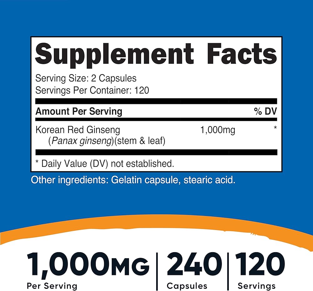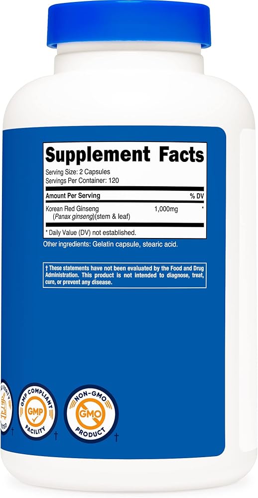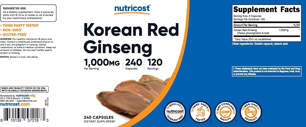 500 ملغ من الجينسنغ الكوري الممتاز لكل كبسولة قوة إضافية 1000 ملغ لكل جرعة 240 كبسولة لكل زجاجة، 120 حصة لكل زجاجة غير معدلة وراثيًا وخالية من الغلوتين مصنوعة في منشأة متوافقة مع ممارسات التصنيع الجيدة ومسجلة لدى إدارة الغذاء والدواء الأمريكية 500 ملغ من الجينسنغ الكوري الممتاز لكل كبسولة قوة إضافية 1000 ملغ لكل جرعة 240 كبسولة لكل زجاجة، 120 حصة لكل زجاجة، غير معدلة وراثيًا وخالية من الغلوتين، مصنوعة في منشأة متوافقة مع ممارسات التصنيع الجيدة ومسجلة لدى إدارة الغذاء والدواء الأمريكية.