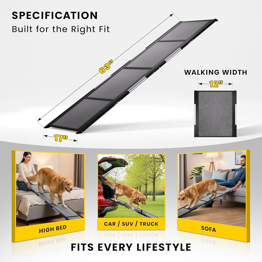 منحدر الكلب المحمول للسيارة-منحدر سيارة للكلاب القابلة للطي للشاحنة وسيارات الدفع الرباعي والسرير المرتفع والأريكة مع أقدام مضادة للانزلاق وسجاد الجر-صغير إلى كبير من السلالات الكبيرة (63 "طويلة و 17")