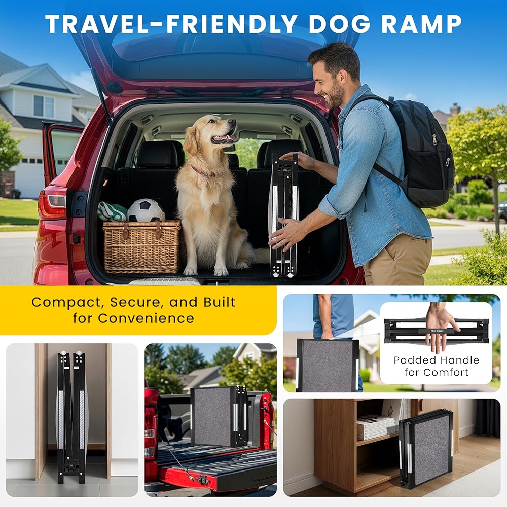 التصميم المدمج رباعي الأفق-منحدر سيارة للكلاب متعددة الاستخدامات يطوي أربعة أقسام لسهولة التخزين والنقل ، مما يجعله مثاليًا للسيارات ذات مساحة جذع محدودة.