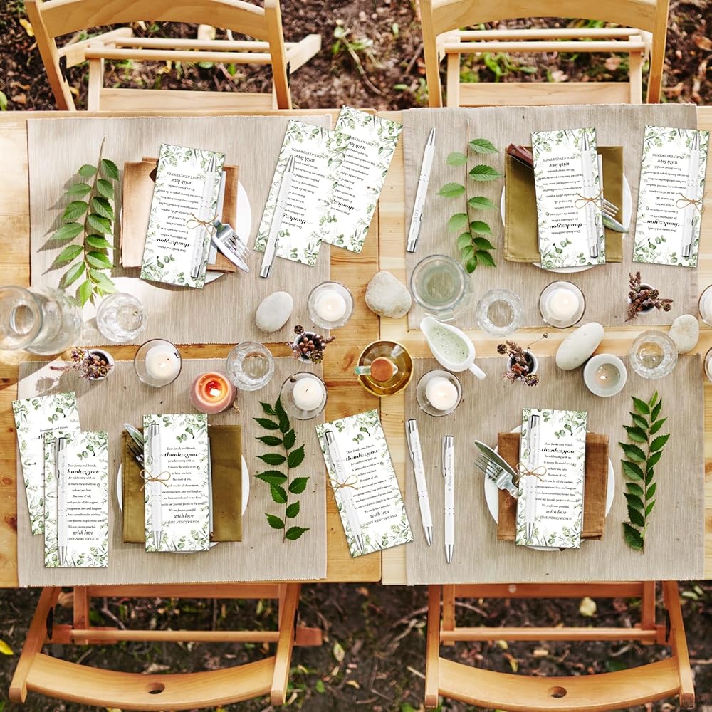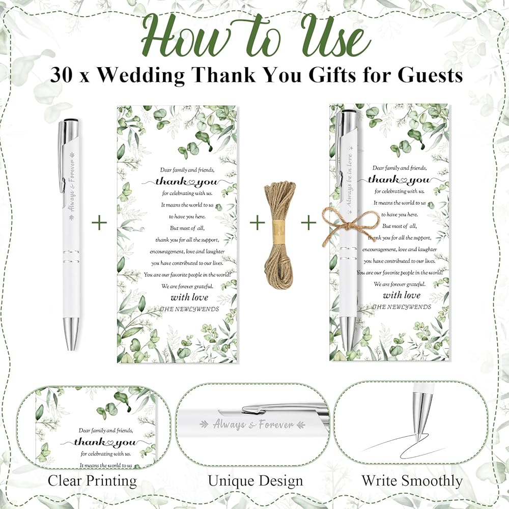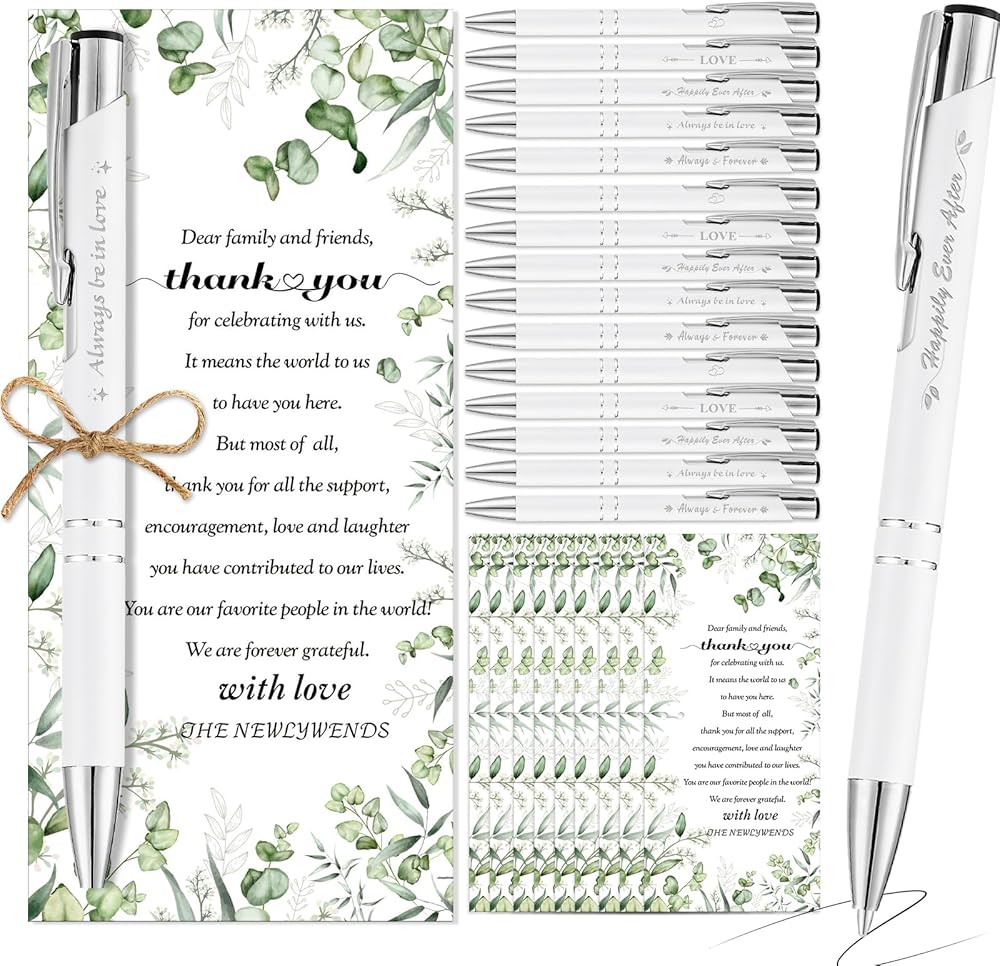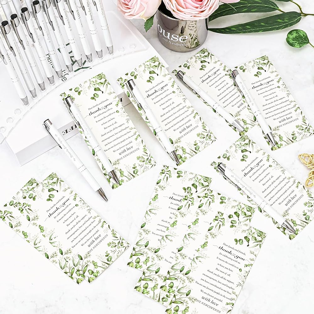 Quality Material and Smooth Writing: these wedding ballpoint pens are made of High-quality material and fast-drying black ink for a smooth writing experience.our wedding thank you cards are made of coated paper, with clear printed on one side, not easy to fade, and perforated on the top for easy use.You can use it for a long time.