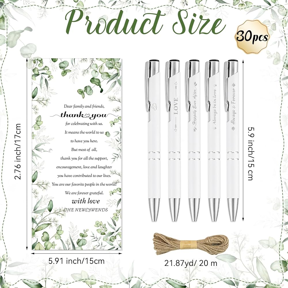 Nice Wedding Favors: You will receive 30 wedding pens in 5 designs,6 pieces for each design, 30 wedding thank you cards and a bundle of hemp rope for attaching the pens to the cards;abundant quantity and different styles can meet your daily matching use and replacement needs on weddings,you can share with the guests at wedding party.