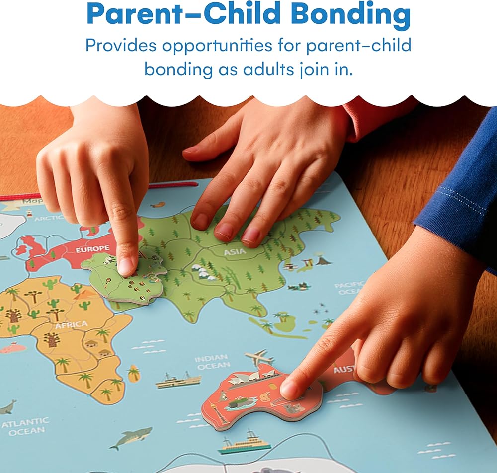 • التعلم التفاعلي: تمثل كل قطعة لغز بلدًا ، مما يساعد الأطفال على تعلم الخرائط والأعلام والعواصم مع تحسين مهارات حل المشكلات من خلال اللعب العملي.