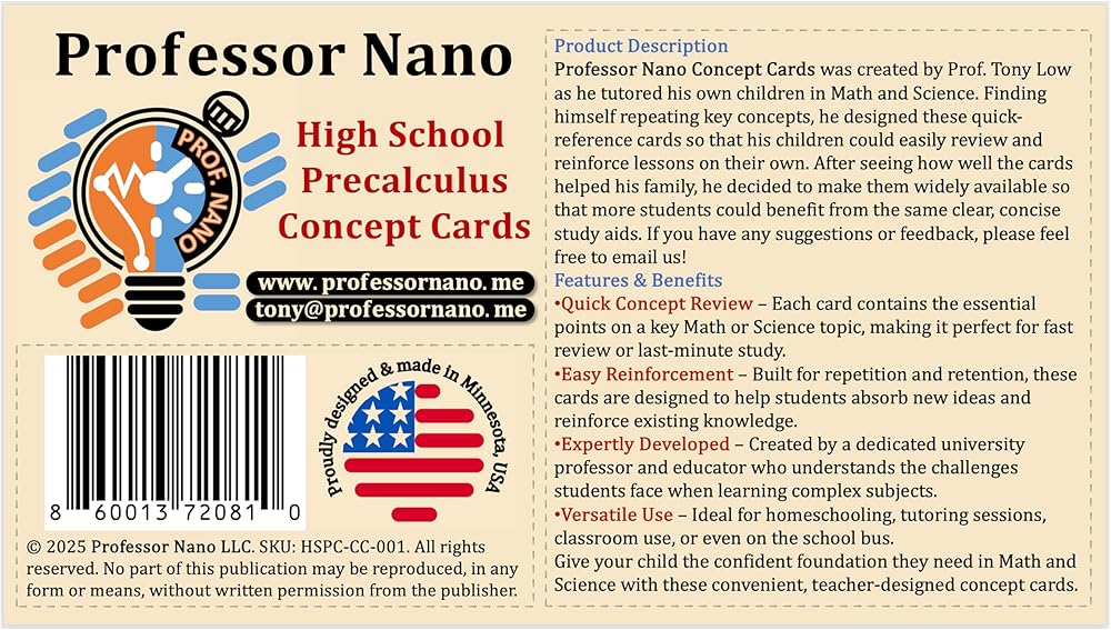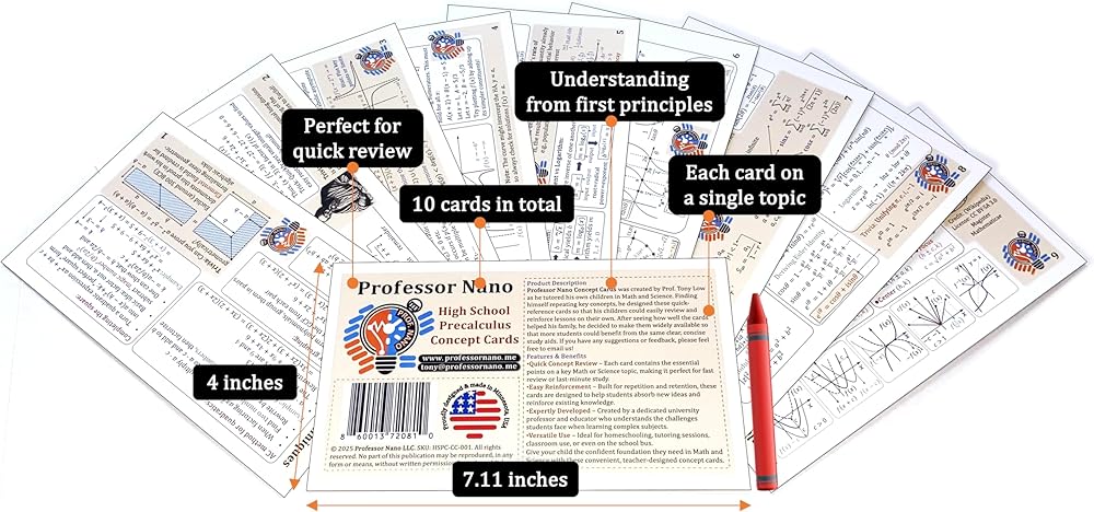 البروفيسور نانو المدرسة الثانوية بطاقات مفهوم precalculus || 4x7.11 بوصة ، مجموعة من 10 || ورقة الغش ، Quickstudy