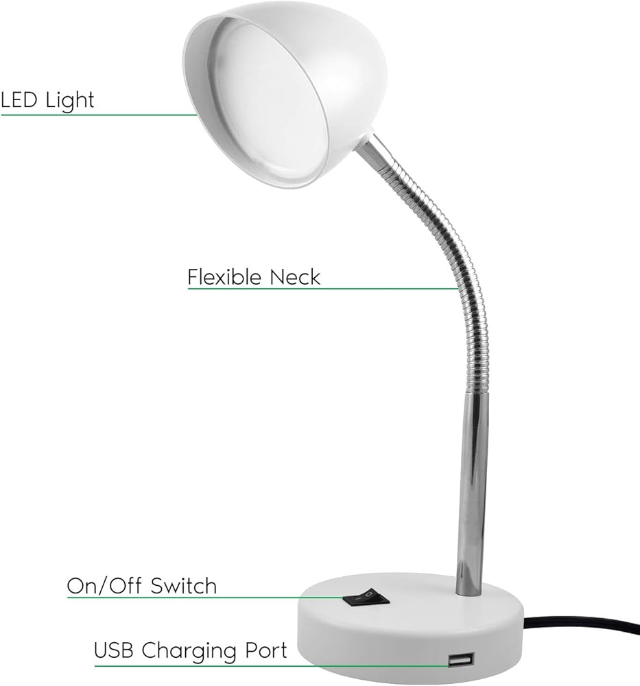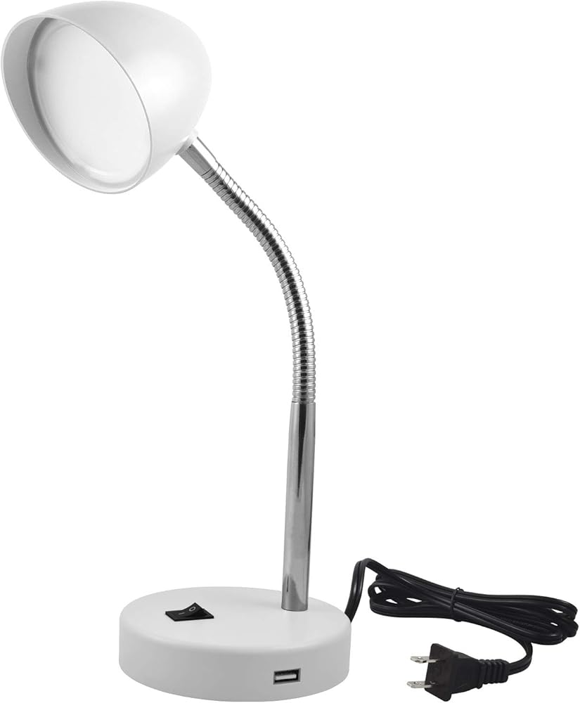MaxLite LED Desk Lamp with USB Charging Port. 3.5 Watts. 220 Lumens. Adjustable metal hose goose neck. Plug In Cord. 3000K Warm White. On/Off switch on base. Energy Star and ETL Listed. 20,000 hours life. Perfect as a desk lamp, table lamp, in bedrooms, kids rooms, living rooms and more.