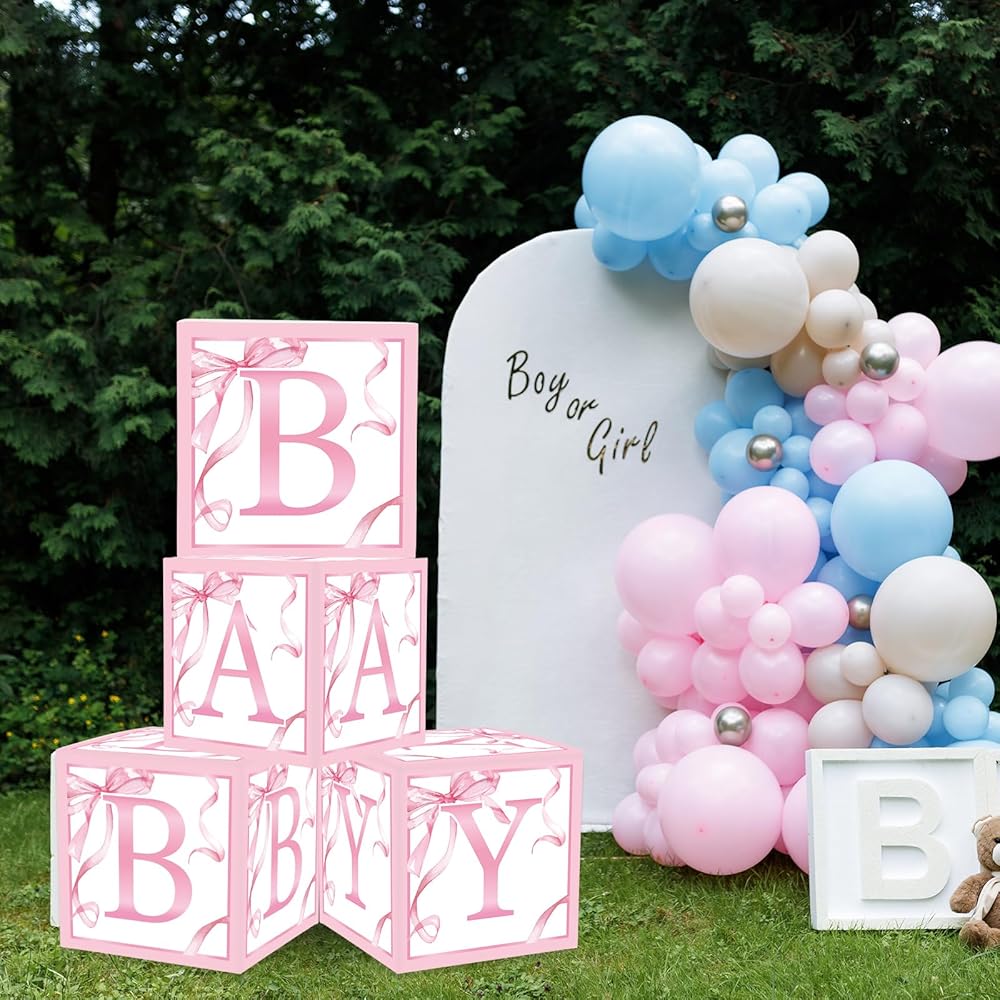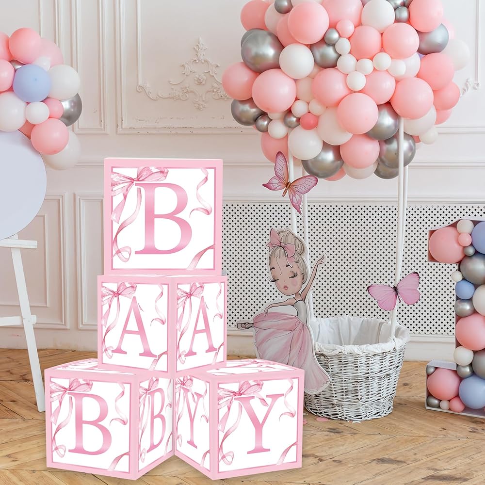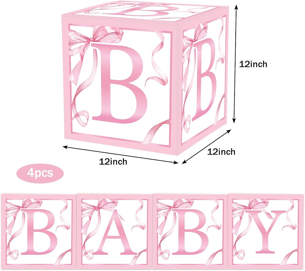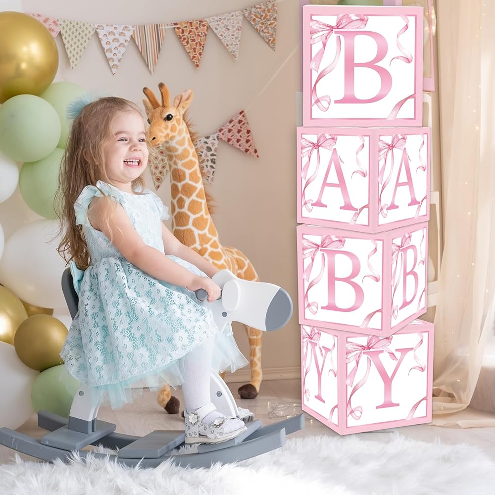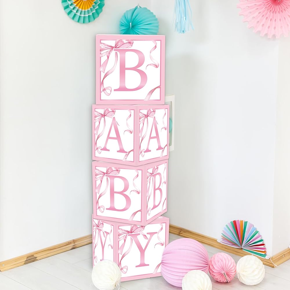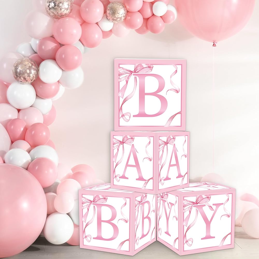 PINK BOW DESIGN: White boxes spell out "B-A-B-Y", and decorated with watercolor pink bow patterns, add a elegant touch to baby showers, gender reveals, or birthday parties
