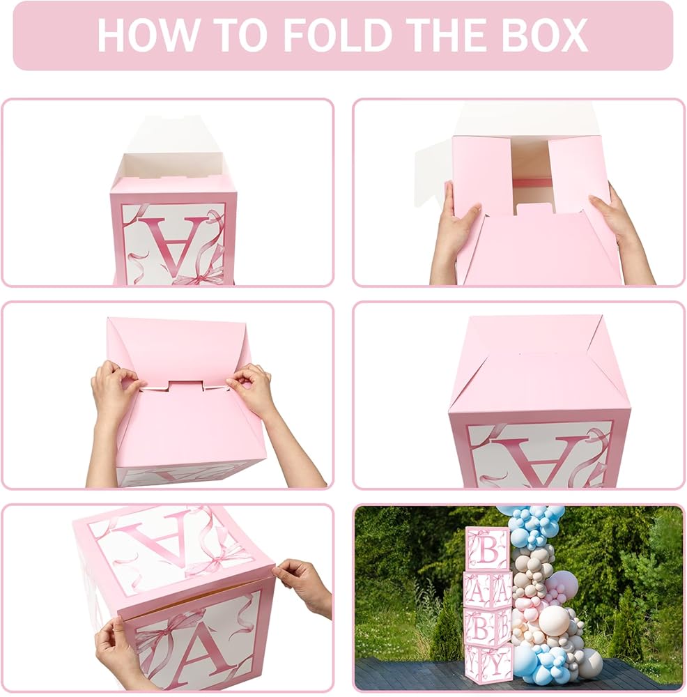 Our cardboard boxes feature watercolor pink bow patterns, create a cheerful backdrop for baby shower and gender reveal photos.