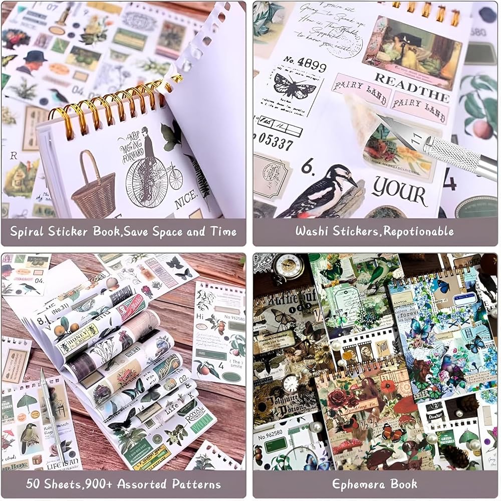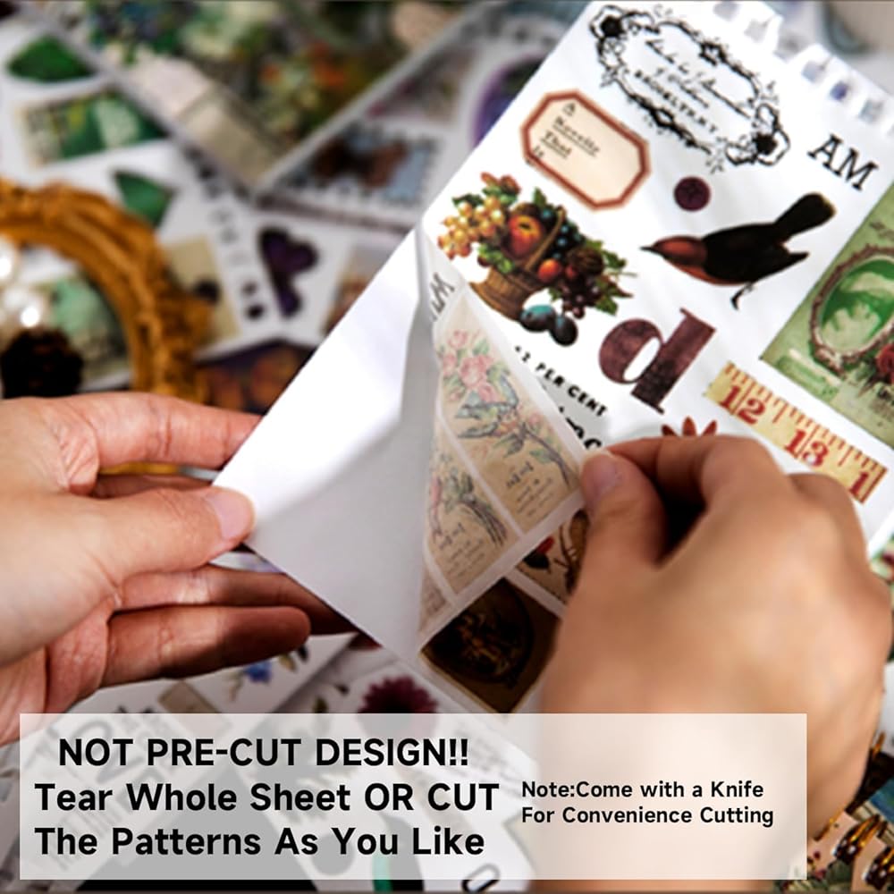 Scrapbooking Sticker Set: Our scrapbooking sticker set contains over 900 pieces/50 sheets of vintage scrapbooking stickers with no repetitions (stickers must be cut out by yourself, we provide a carving knife)