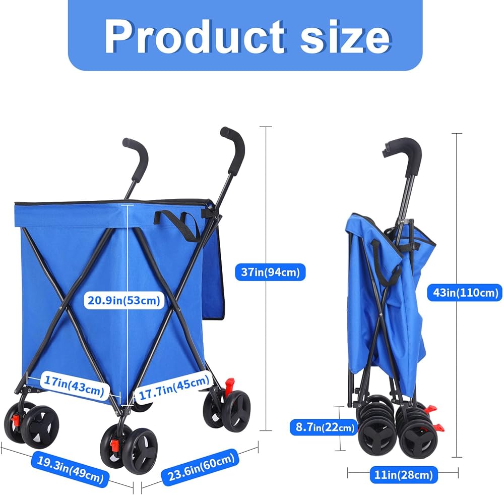 【360°Double Front Swivel Wheels】The Front wheels can rotate 360°degrees.Rear-wheel with brake pedal to prevent inertial sliding that keep safe.The wheels are large to reduce vibration from the road surface, and EVA material that is still suitable for absorbing vibration is used,so it protects the items in the instacart.