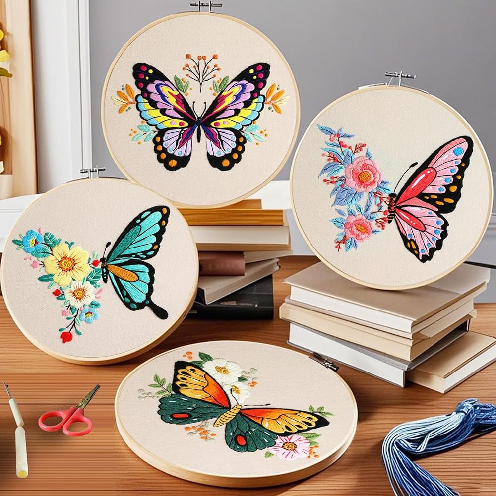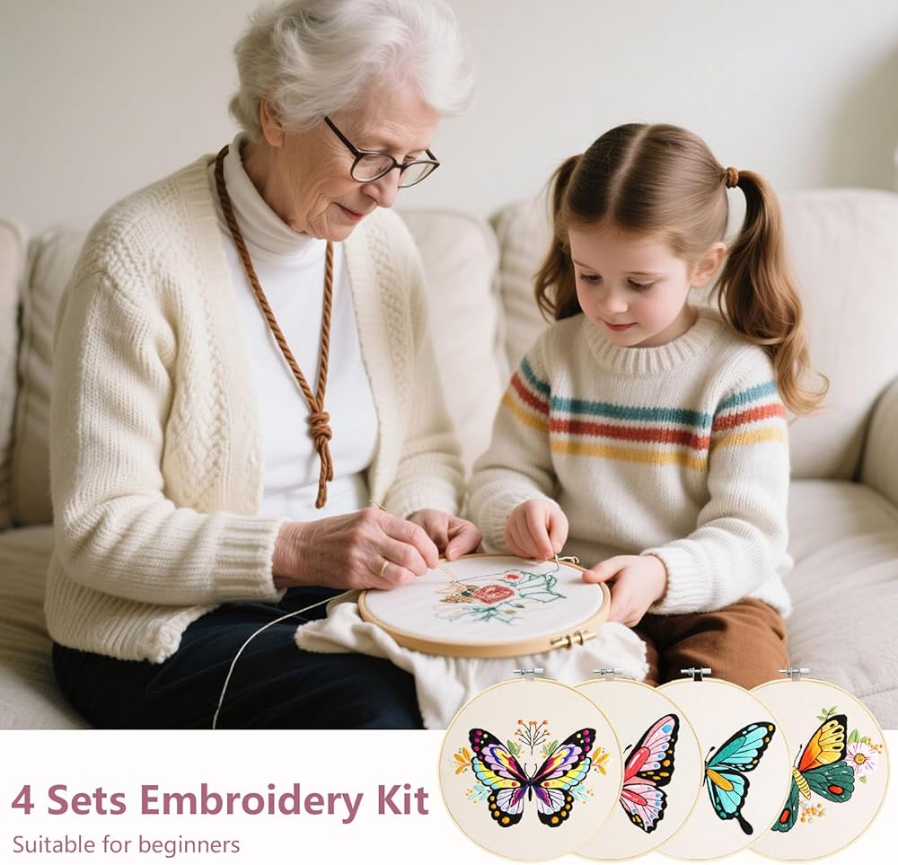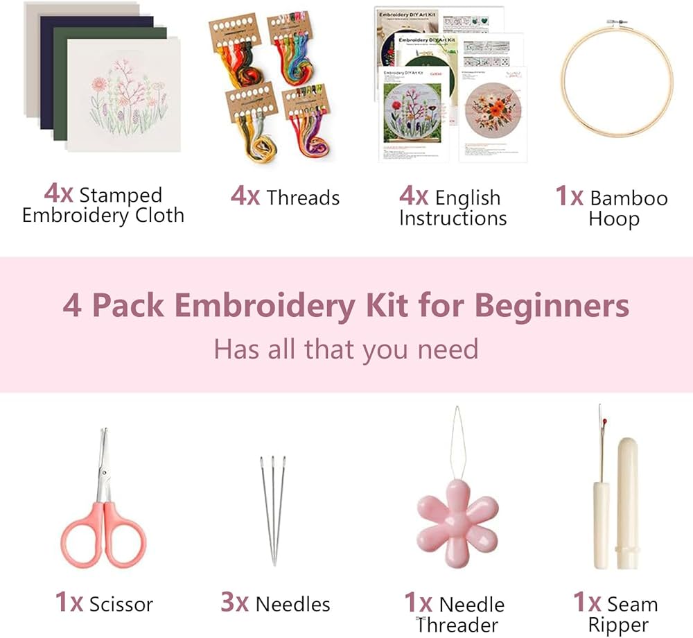【The Perfect Holiday Gift】Everything you need to start embroidering is here. The embroidery kit includes 4 pieces of fabric with patterns, 1 embroidery hoops, 1 needle, 1 seam ripper, 1 pair of scissors, colorful embroidery threads, 12 embroidery needles, and 4 English instruction books.